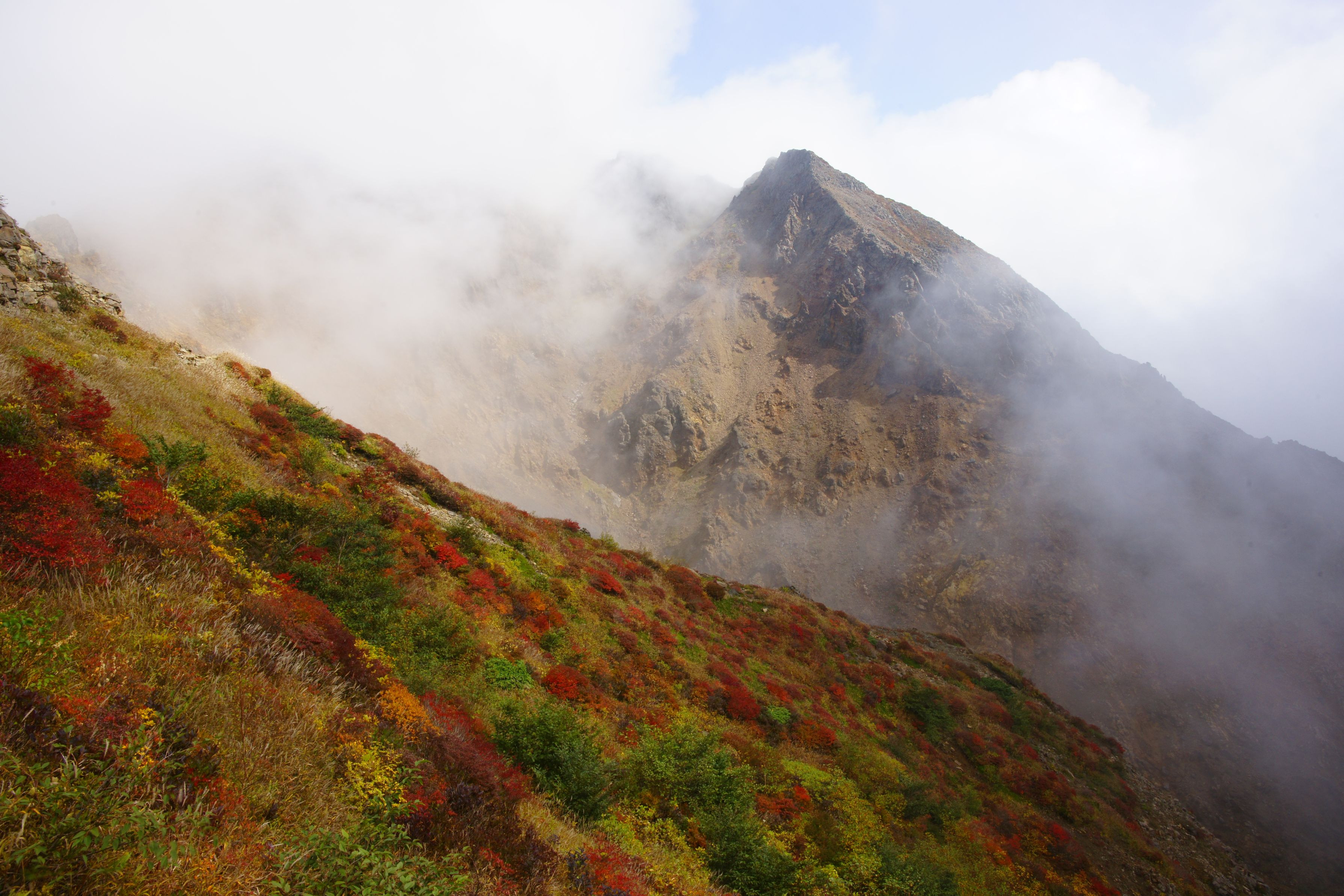 姥ケ平の紅葉撮影で早朝から茶臼岳の山道を登ったが、途中秋色に染まった山肌とその向こう側にそびえる朝霧に煙った朝日岳に陽が差し込み始めた瞬間。感動的な風景となった。