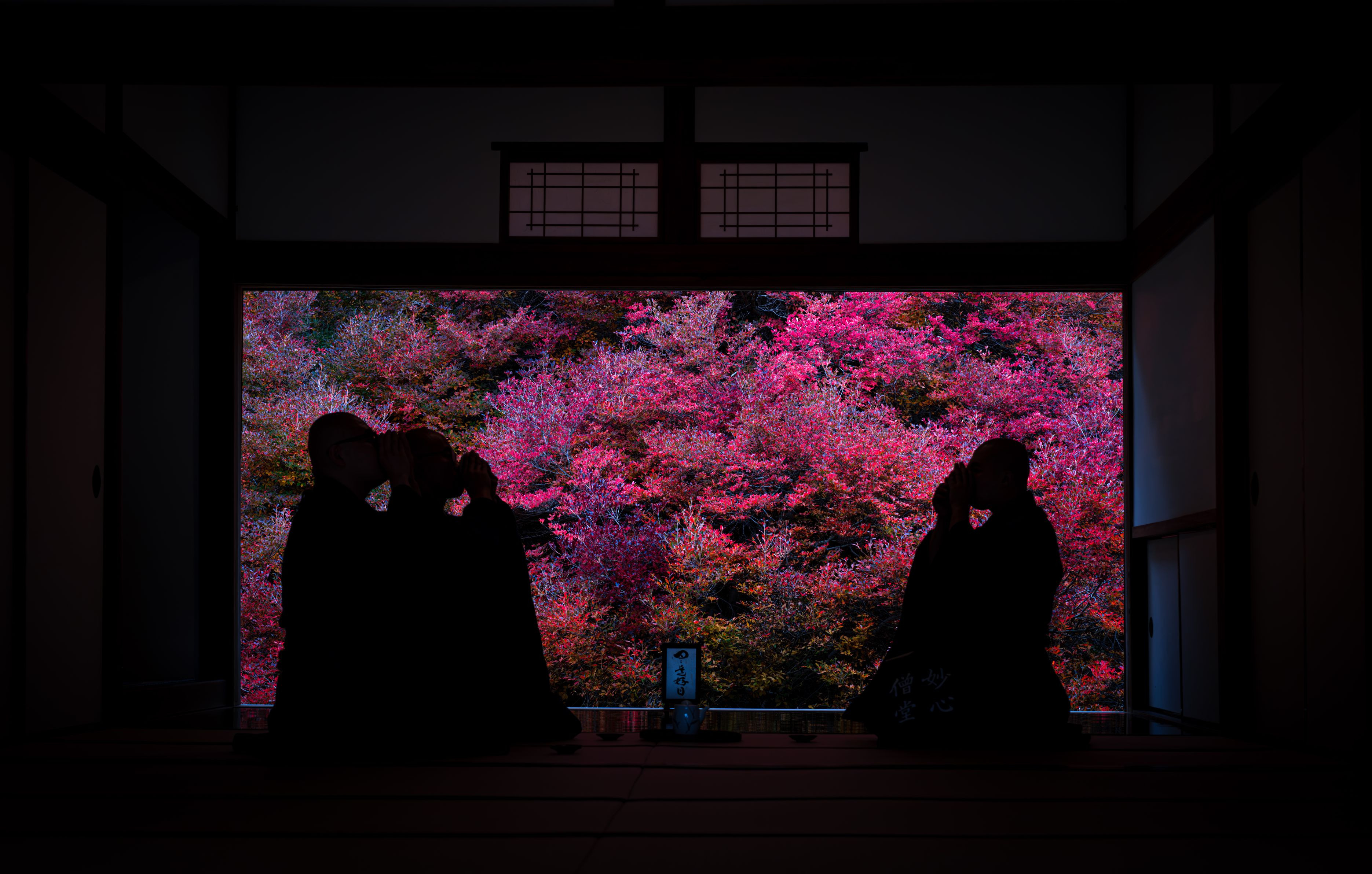 紅葉が遅れていたため間に合いました、タイミング良く京都 妙心寺からお坊様も来られており撮影できました。