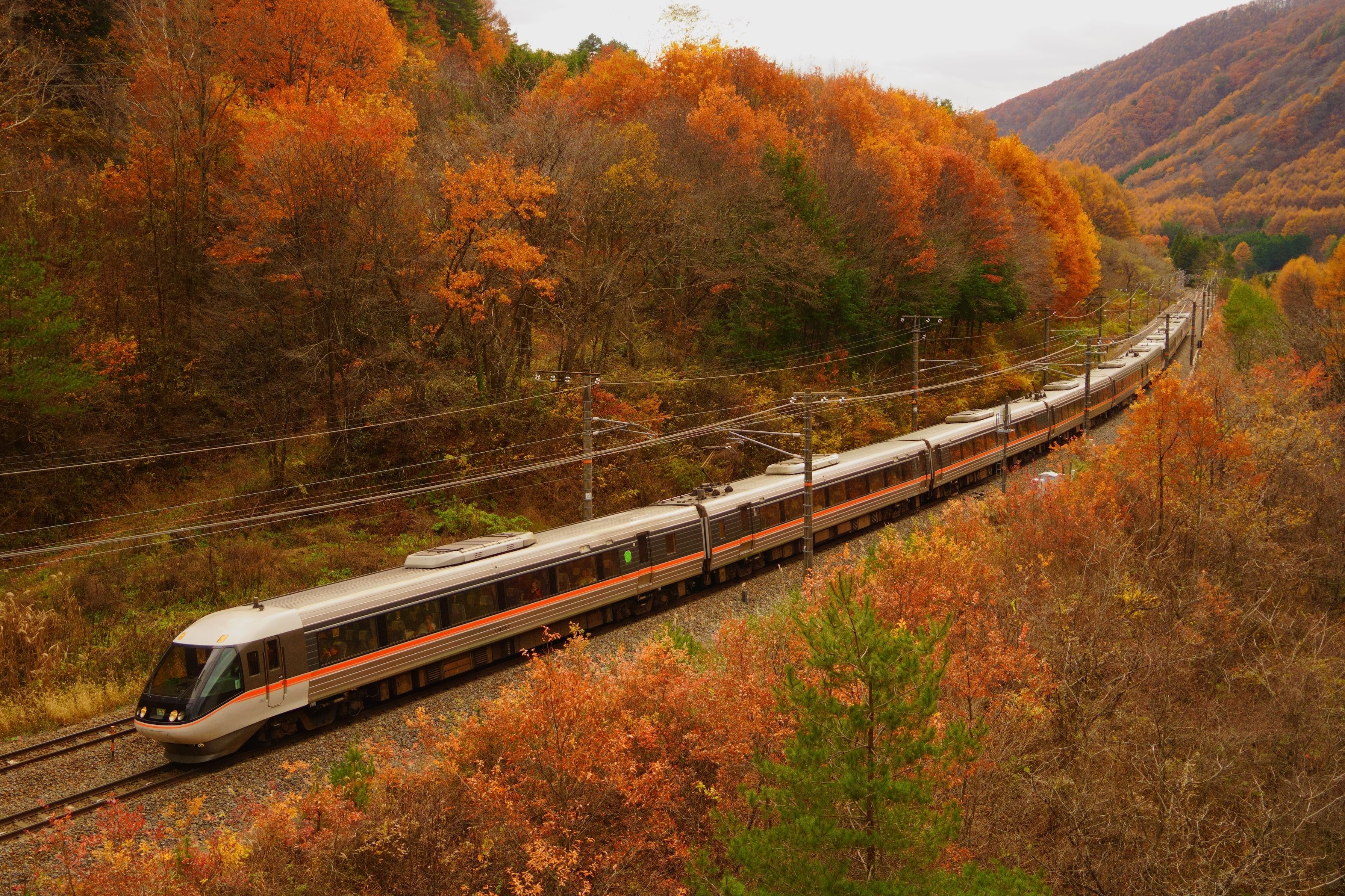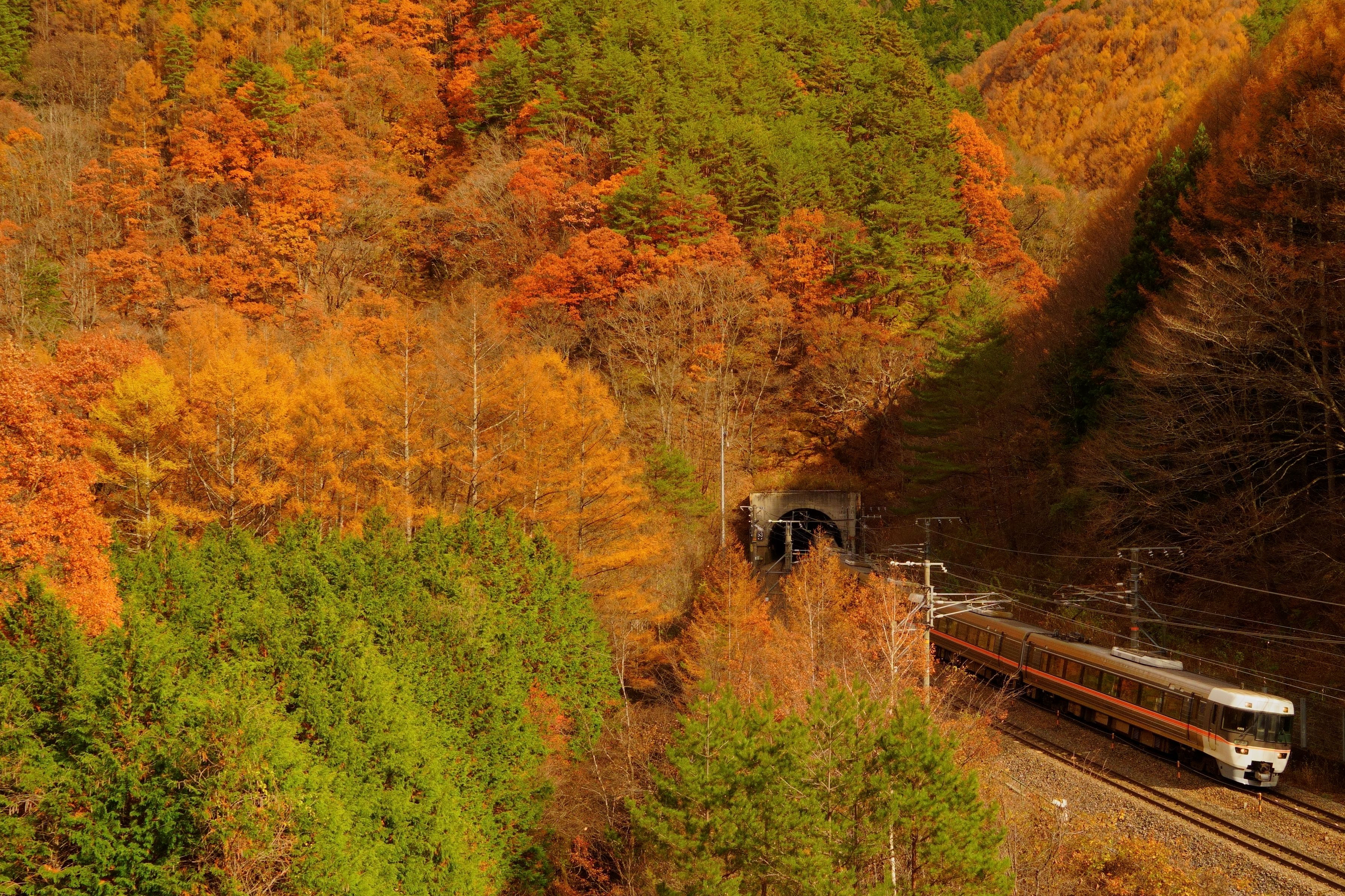 この場所も有名な撮影場所なので 最終日に寄ってみました。 特急しなのが鳥居峠を駆け上がっていきました。 秋一色で、木曽路の一番良い季節に来られて良かったです。 JR東海 中央本線・藪原⇔奈良井