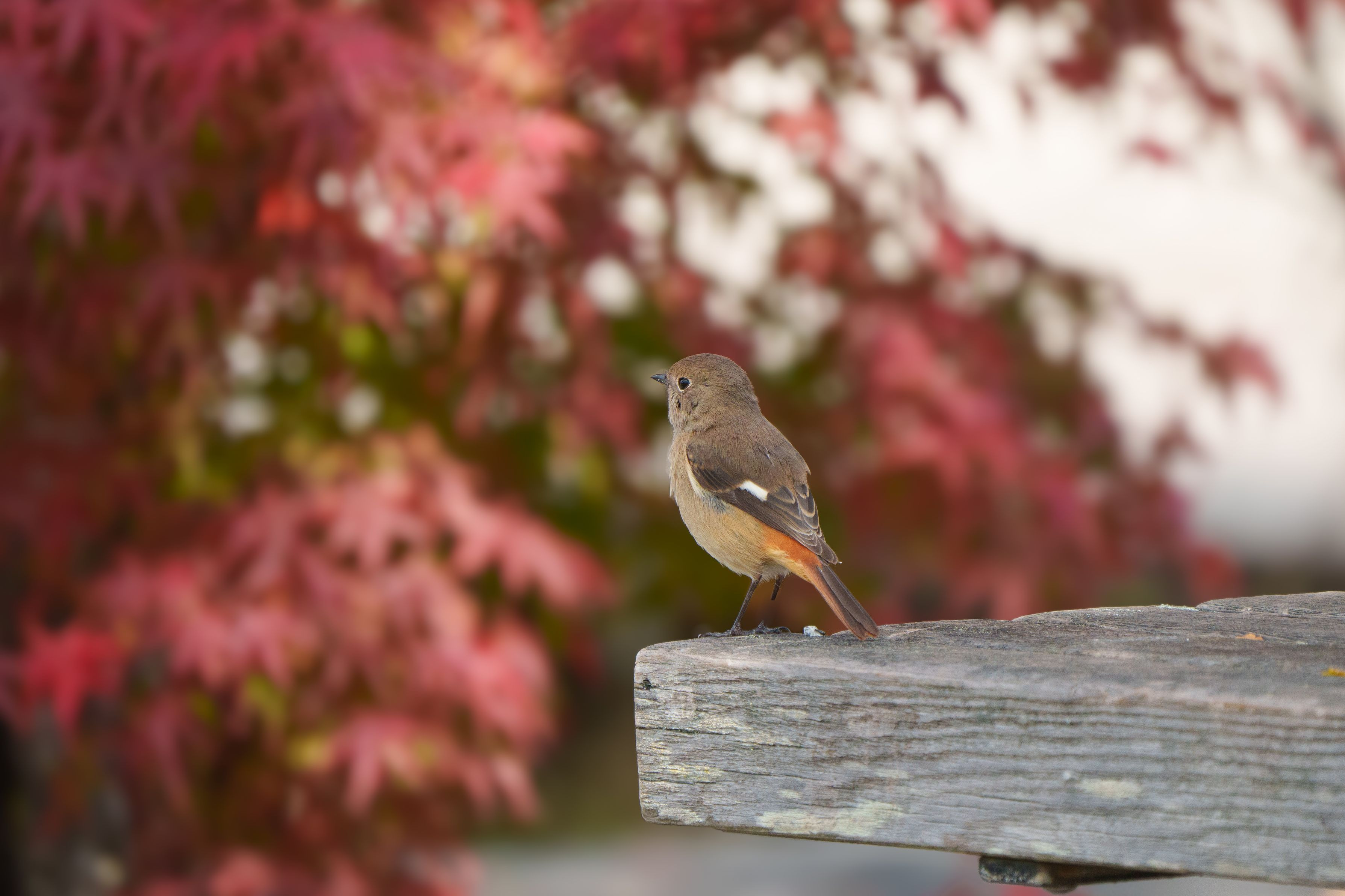 山中湖畔のジョビ子さん、真っ赤に色づいたカエデを見ているのでしょうか。 #ジョウビタキ#
