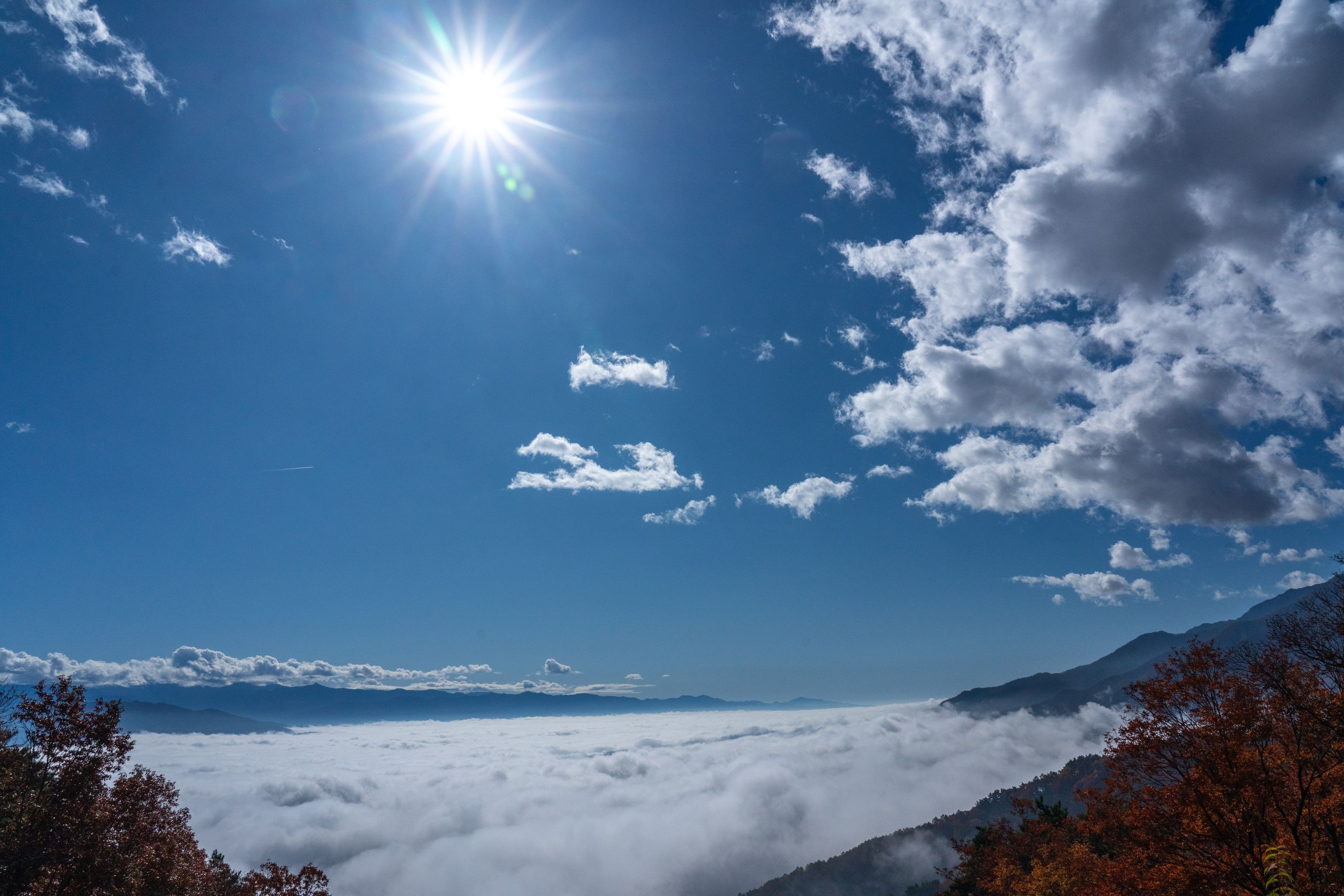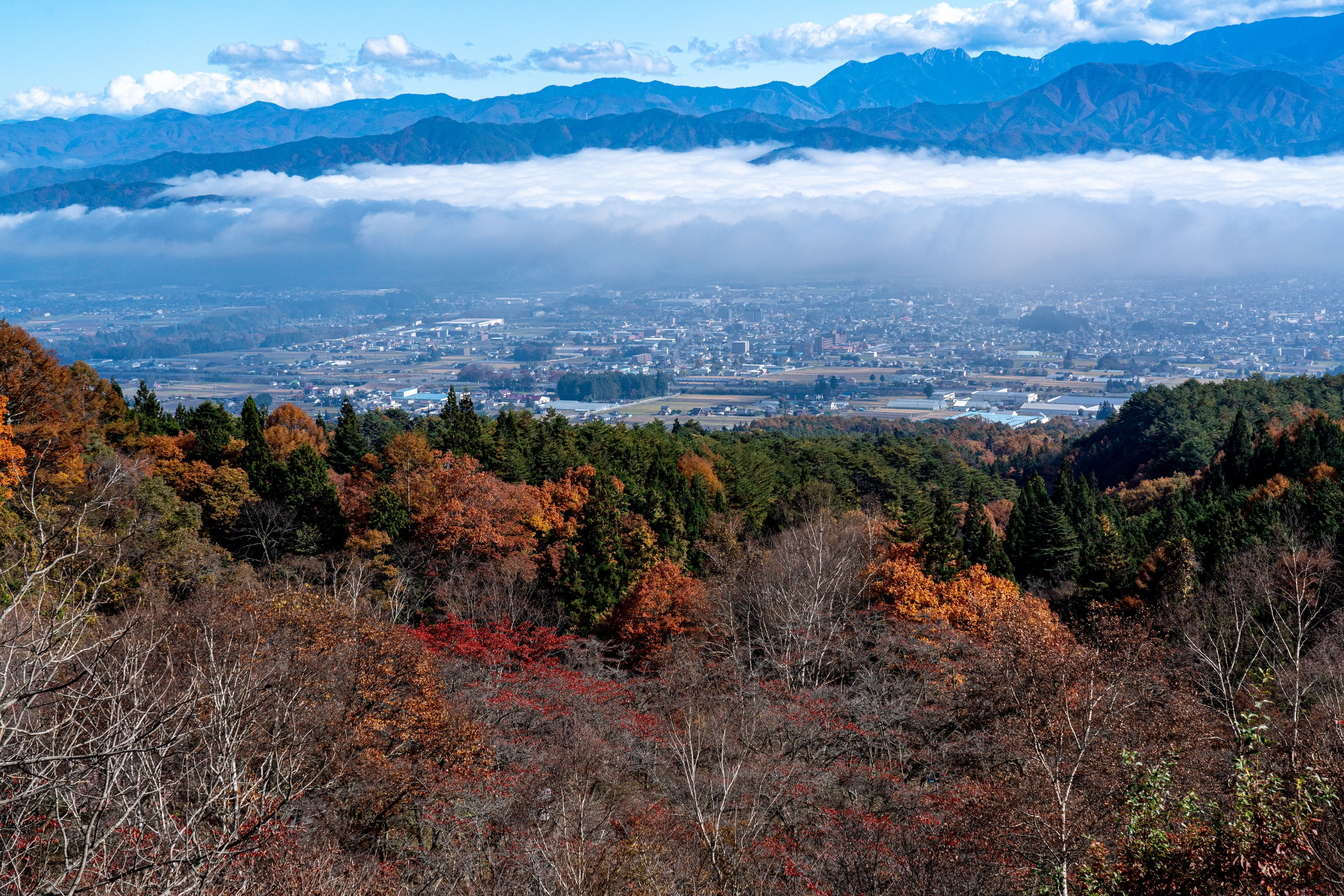下界では曇っている程度でしたが高原に行く林道の途中で下を眺めるとびっくりしました 中ア宝剣岳の麓の光景です