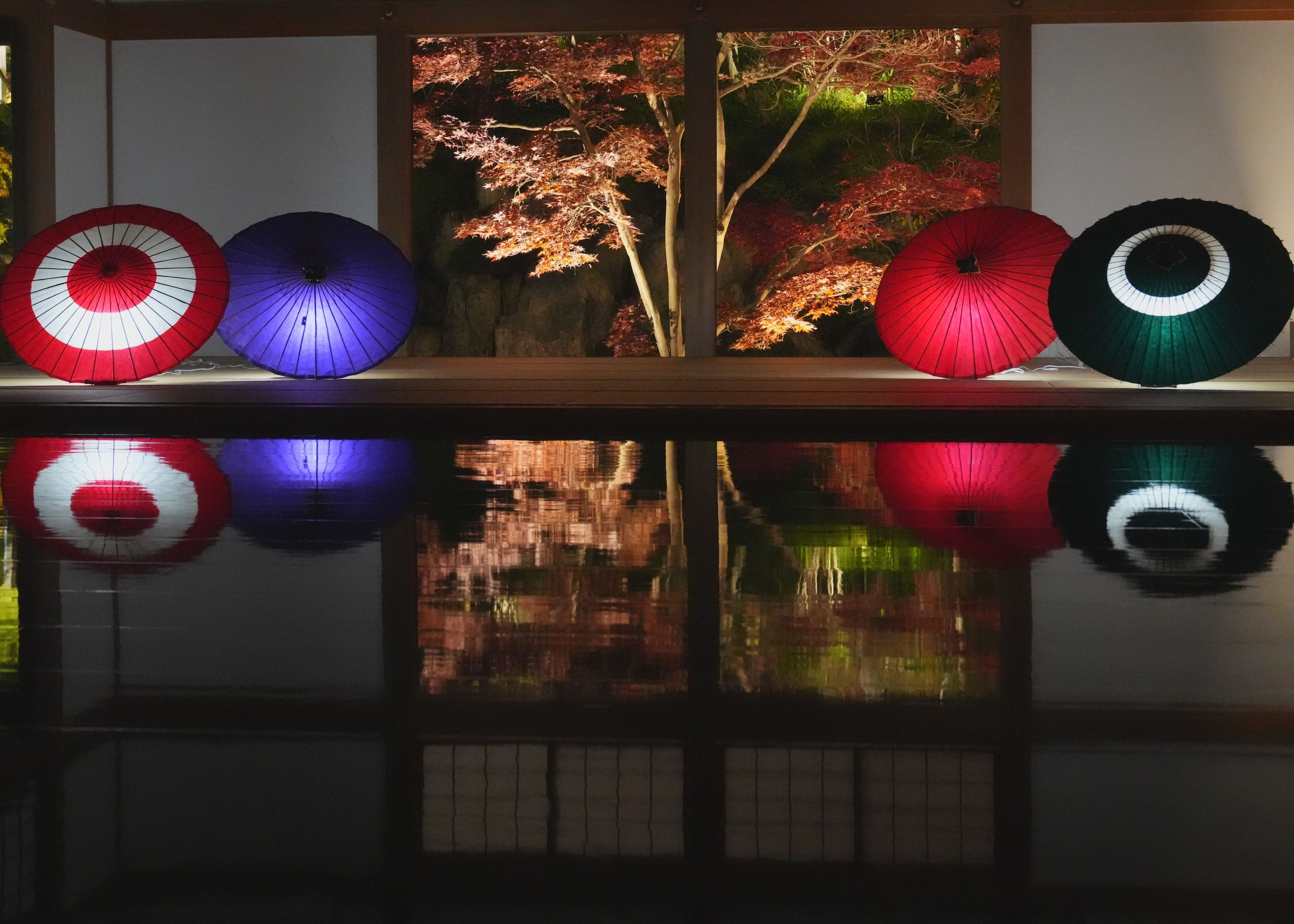 ライトアップされた紅葉と和傘が映りこみ、風情のある景色を作り出していました。