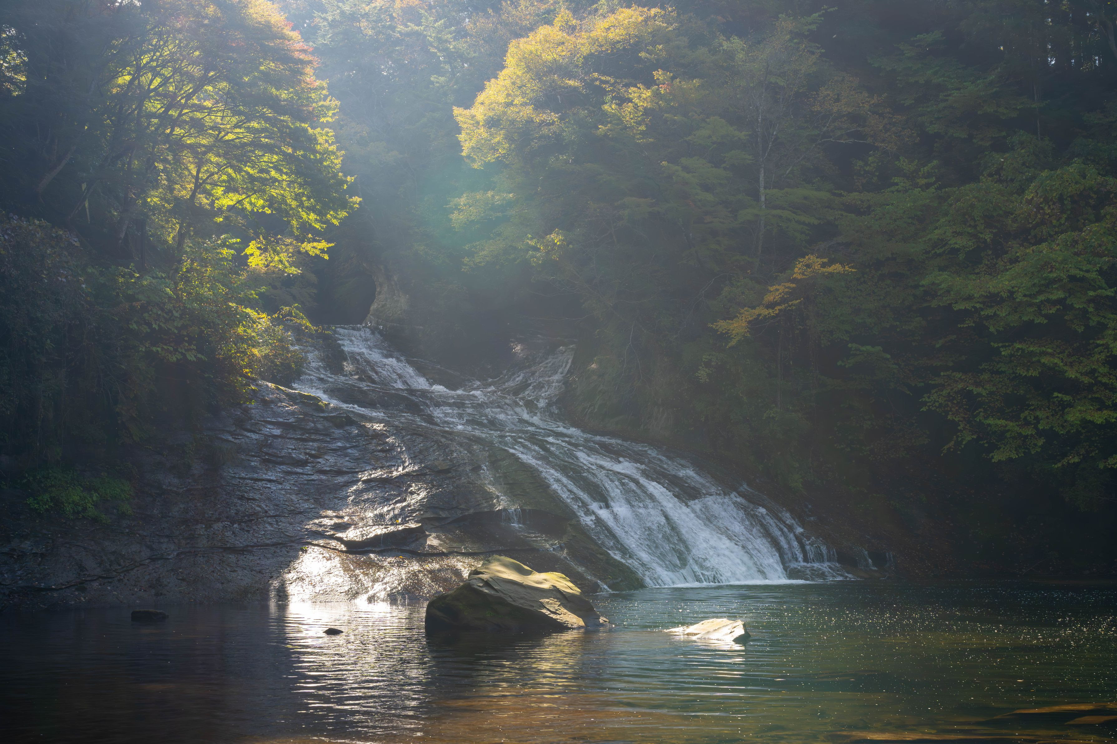 千葉県の粟又の滝での一枚です。 滝の奥から木漏れ日が差し込む様が美しかったので撮影しました。