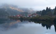 集落の後ろは霧で山が隠れています。