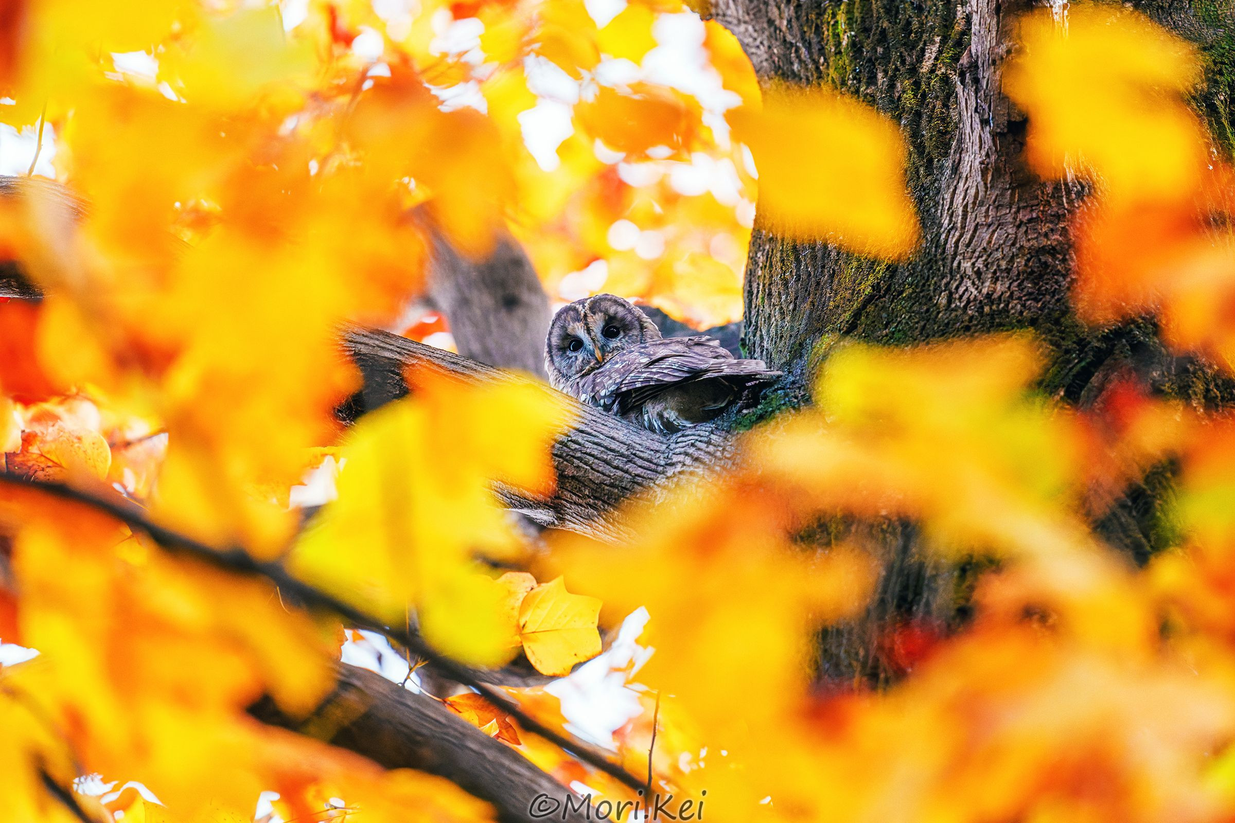 紅葉とフクロウです 念願だった紅葉絡みでフクロウ撮れて感無量 #フクロウ#