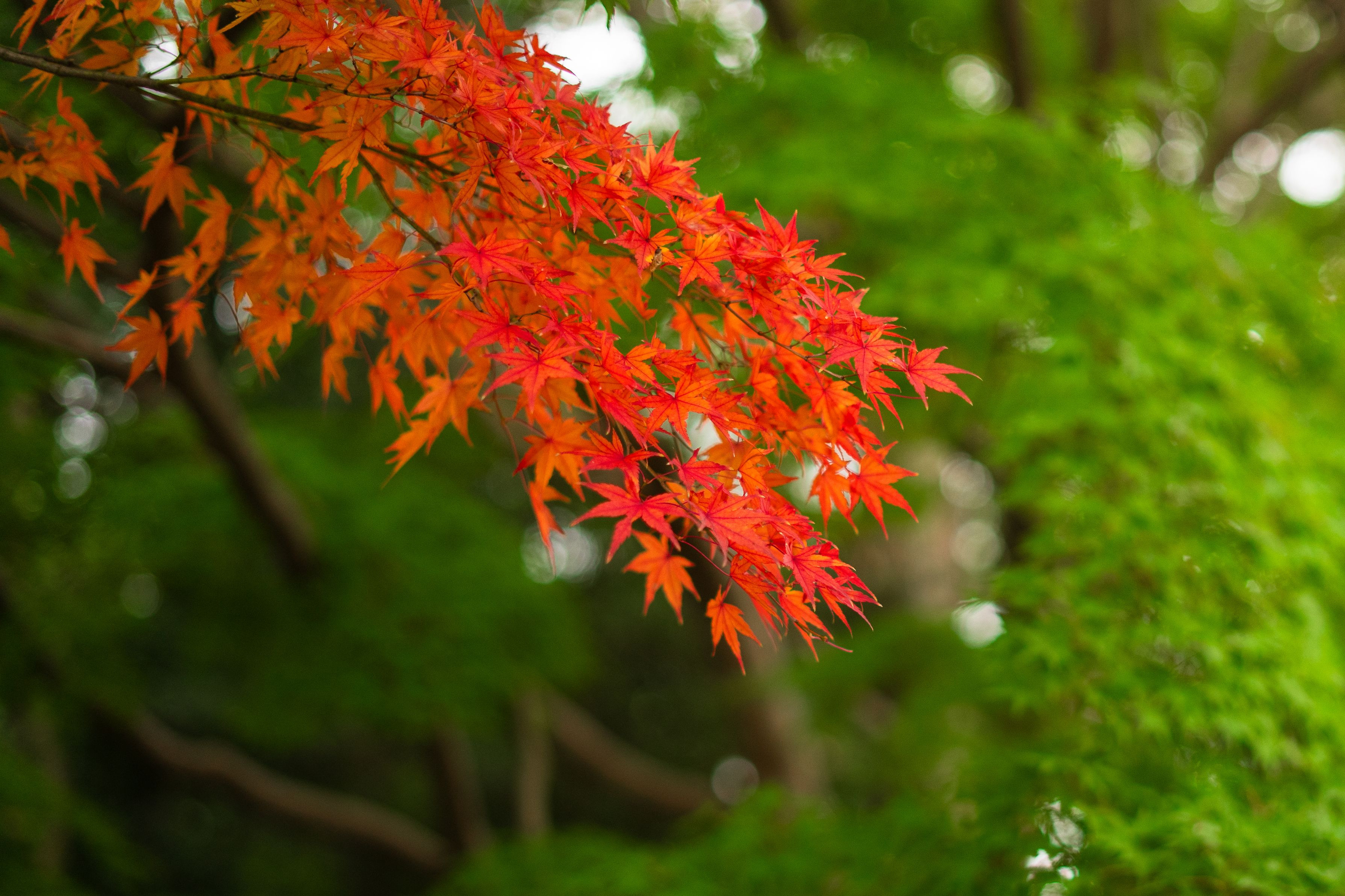 公園に行ったら、このもみじだけ真っ赤でした。緑と赤のコントラストが素敵で、こんな紅葉も悪くないと思えました。
