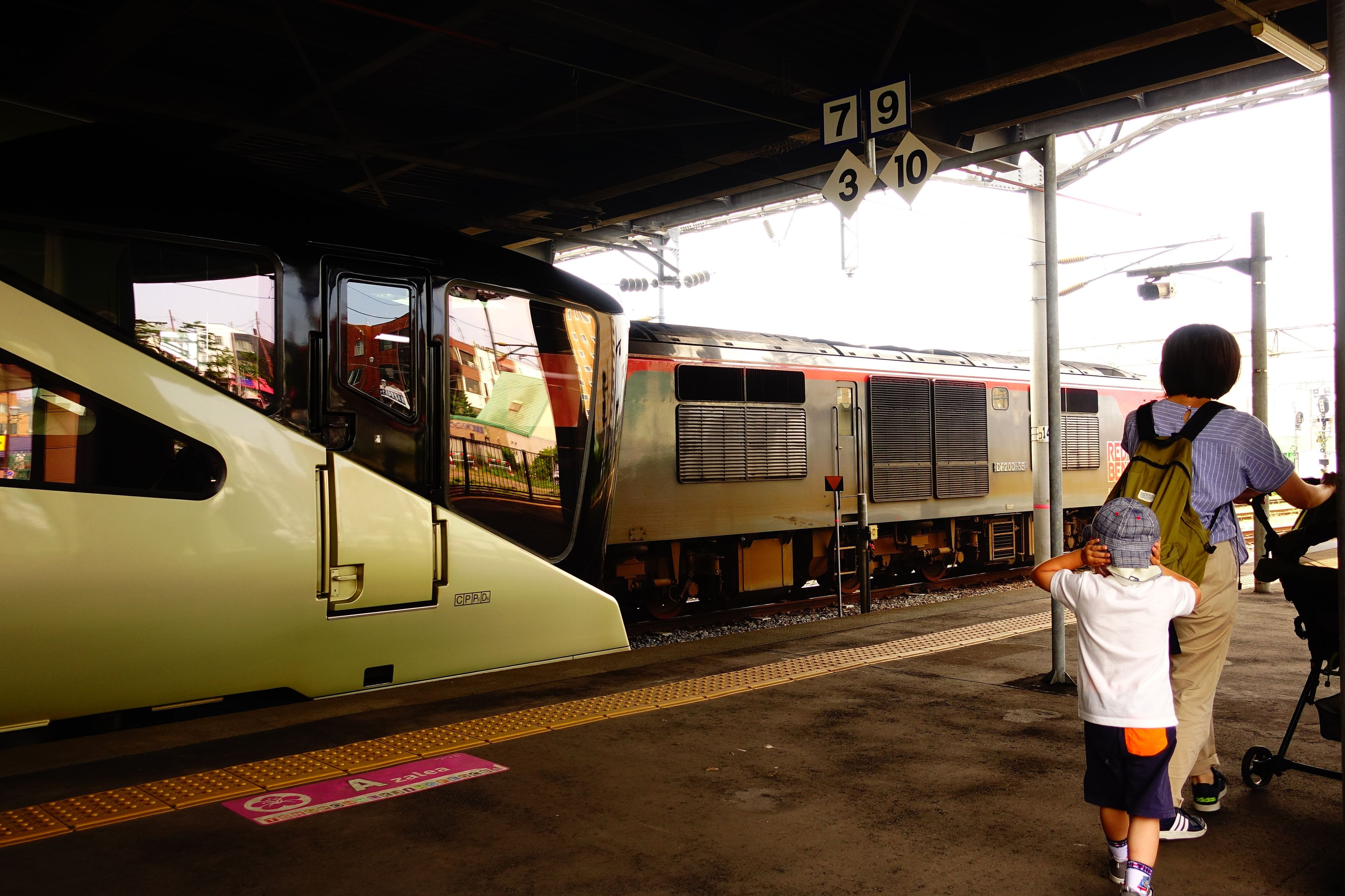 電車として静かに回送されてきた四季島は、1号車と10号車のエンジンを稼働して発車に備えます。隣の線路をトンネルから飛び出すように貨物列車が出現、思わず耳を塞ぐ子供。