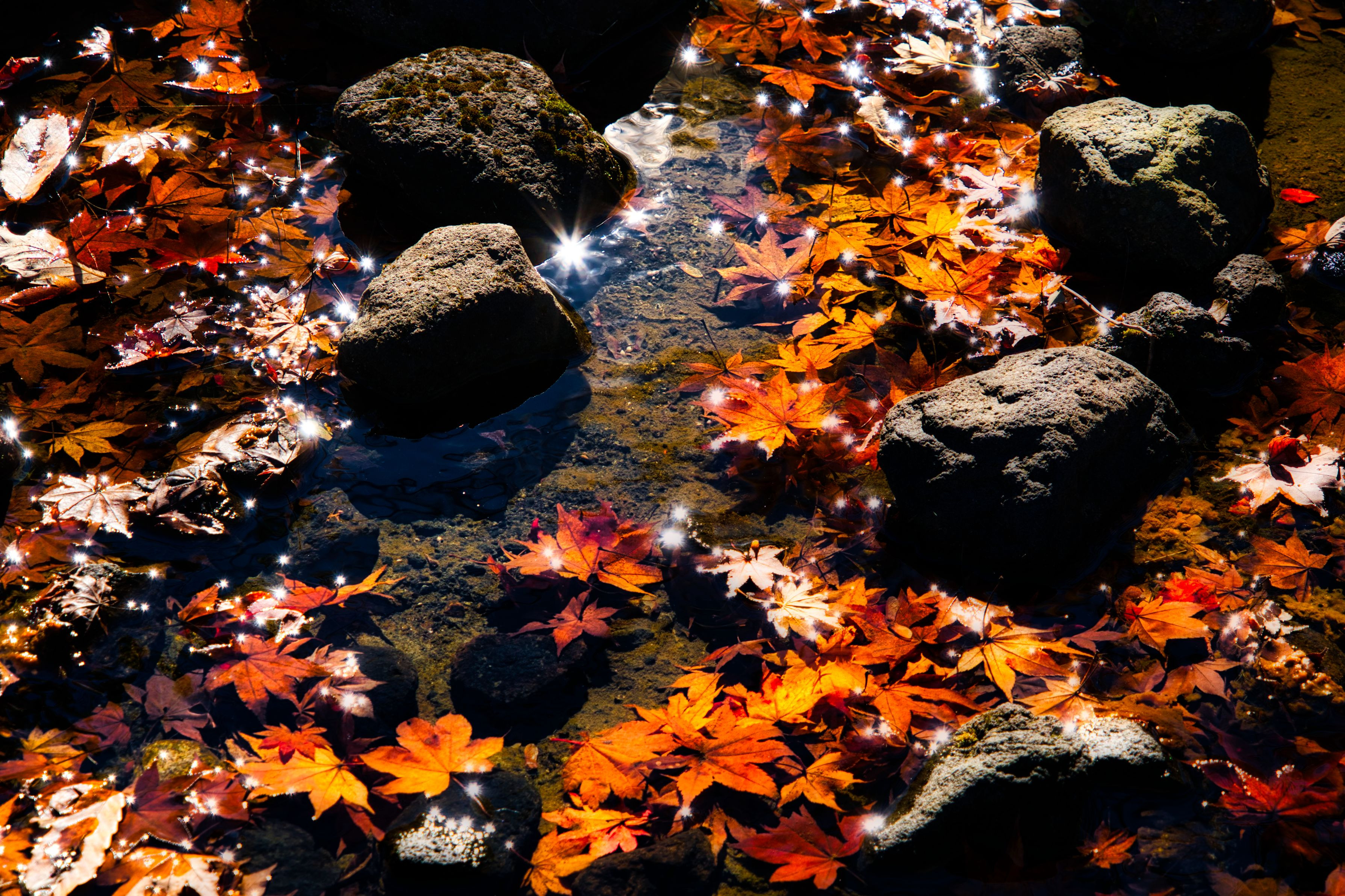 のんびり秋を感じてながら日本庭園を巡りました。 水辺の落ち葉に太陽が差し込み水面・紅葉が輝いてまぶしい! 絞り枚数:7枚なので倍数:14本のギラギラ光条で輝く紅葉を表現しました。