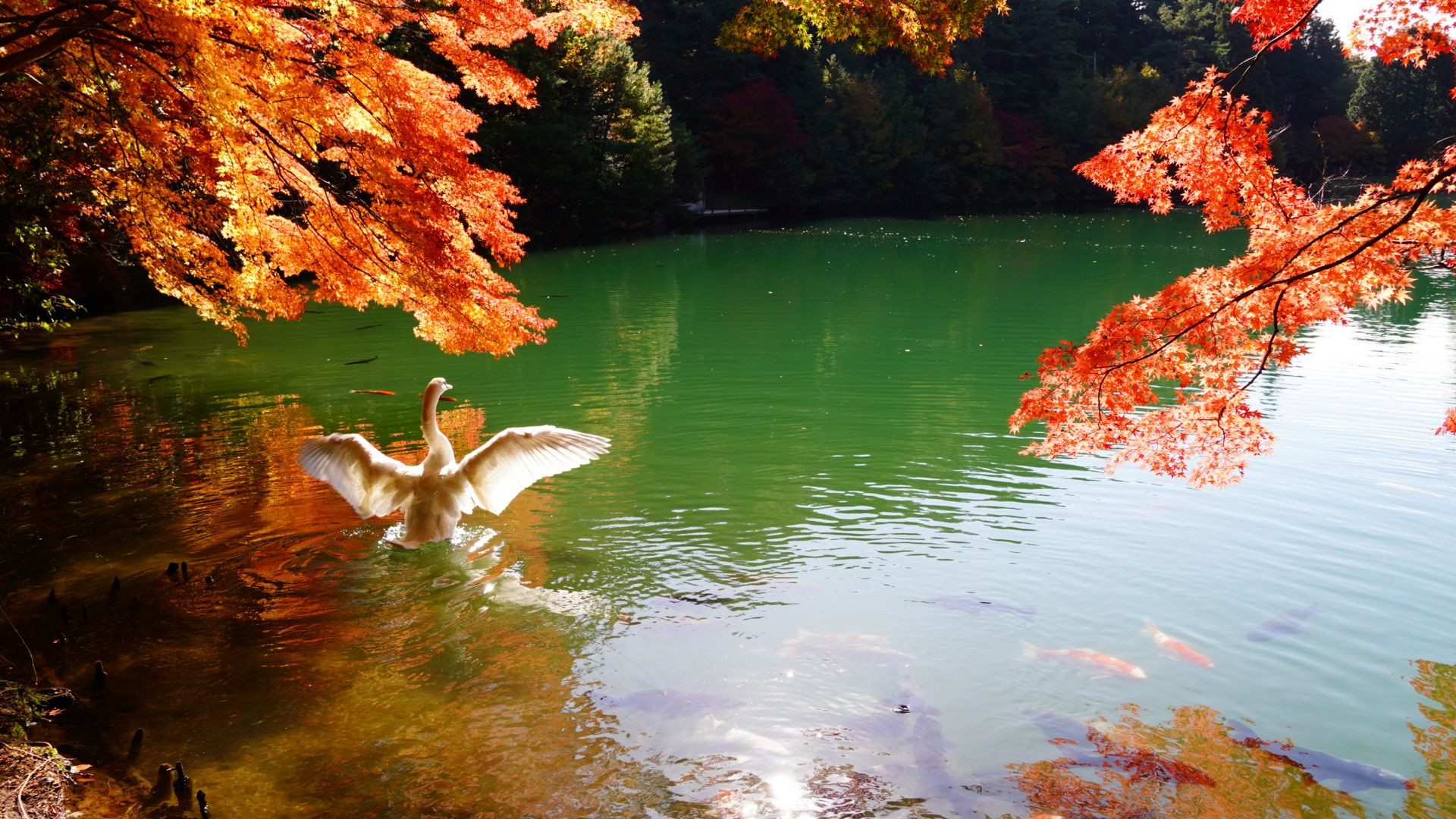 紅葉、白鳥の羽ばたき、錦鯉の共演に癒されます。