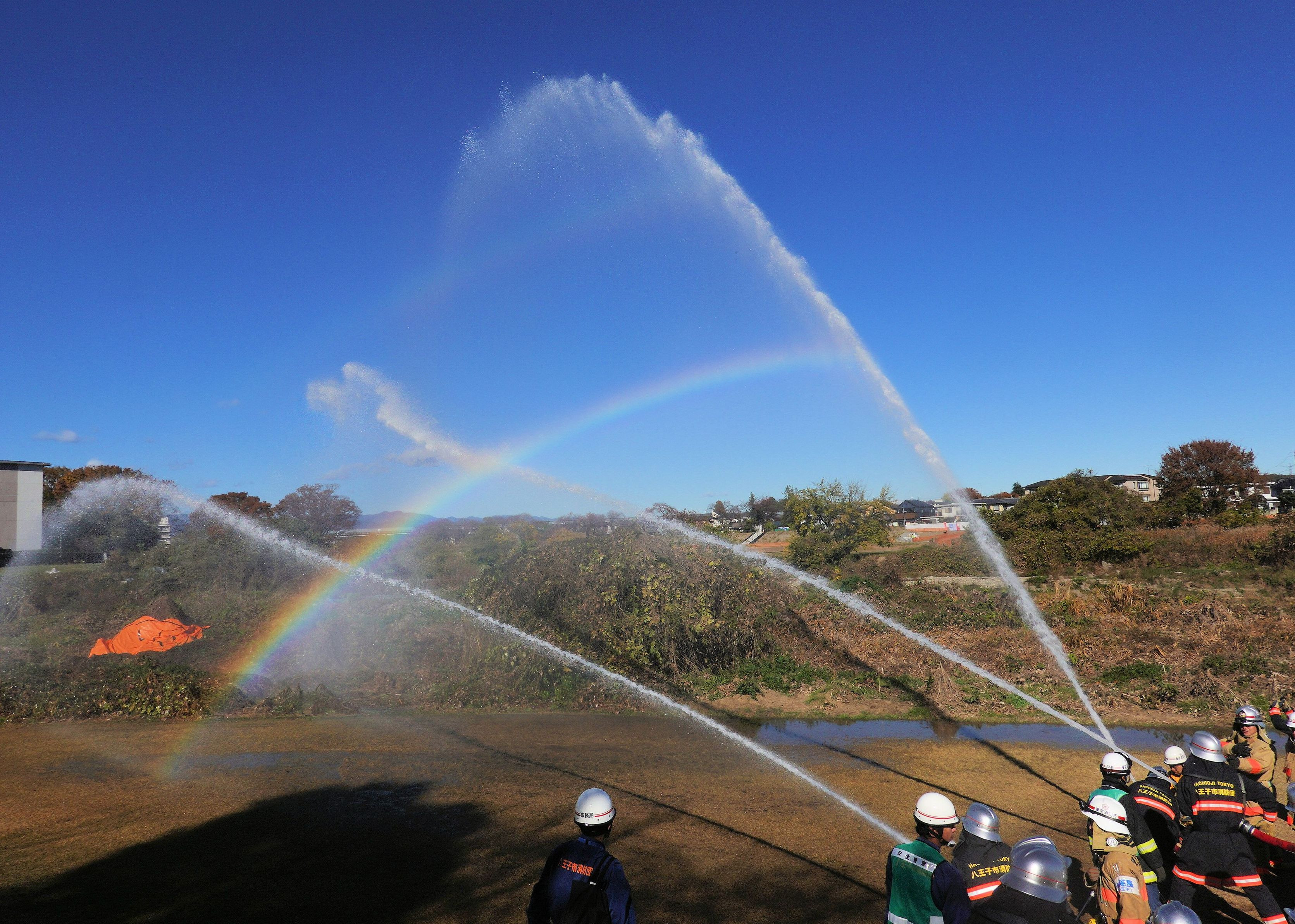 消防団の合同訓練中、きれいな虹が現れた。