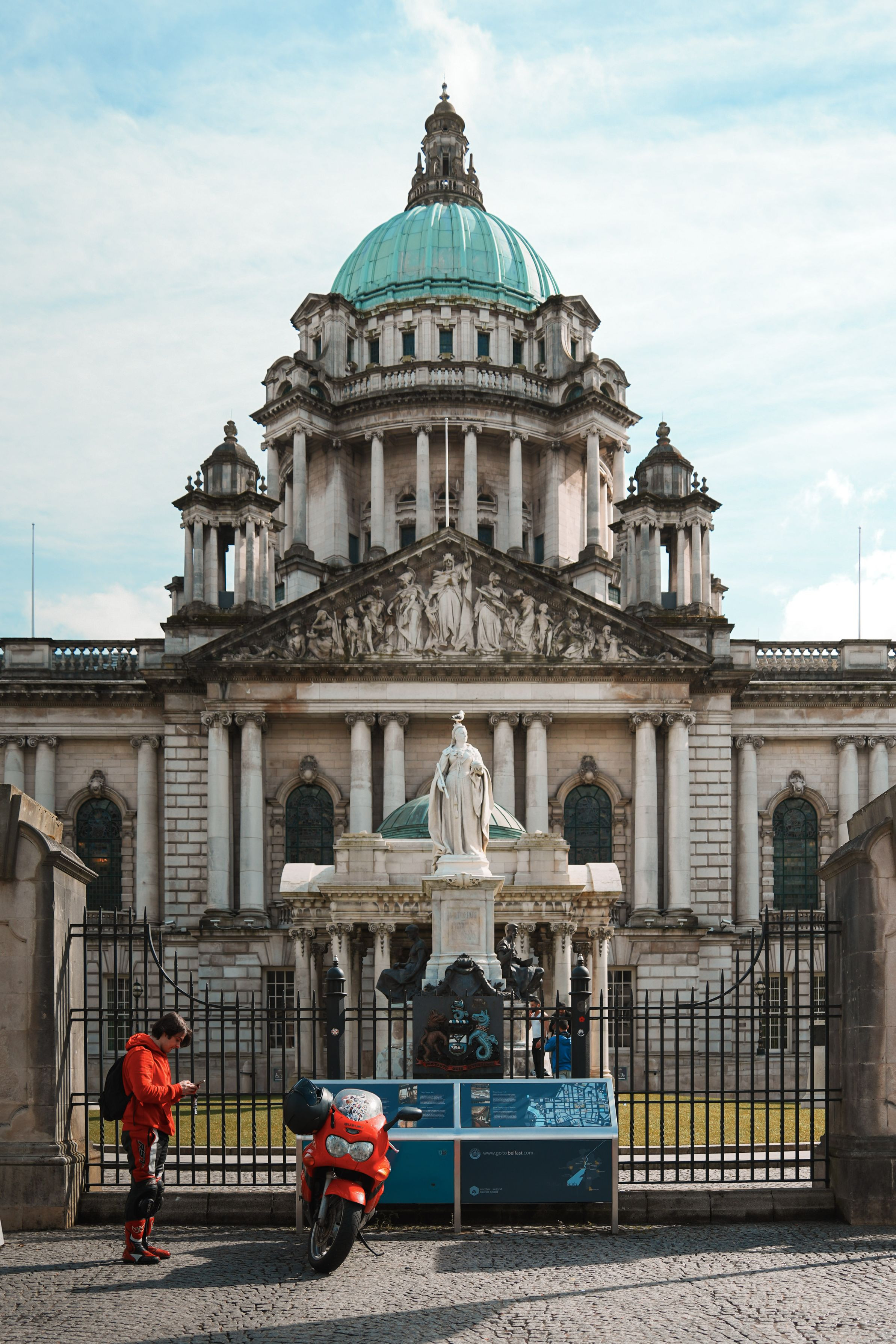 北アイルランドの中心都市ベルファストの象徴である『ベルファスト市庁舎』。 その正面に真っ赤なバイクと真っ赤なライダー。 これは立派な景観法違法案件。