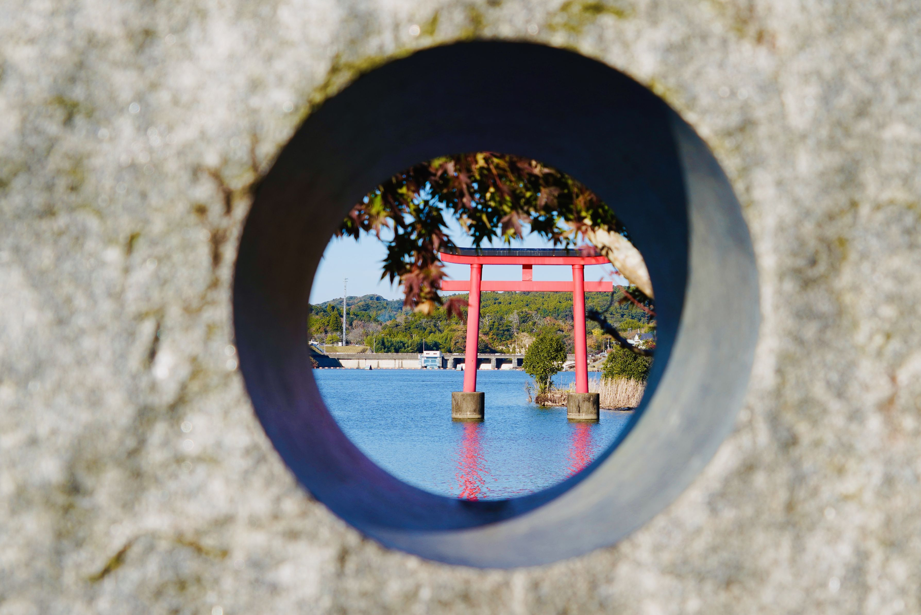 君津市亀山湖の湖面鳥居、紅葉はちょっと早いけど🍁