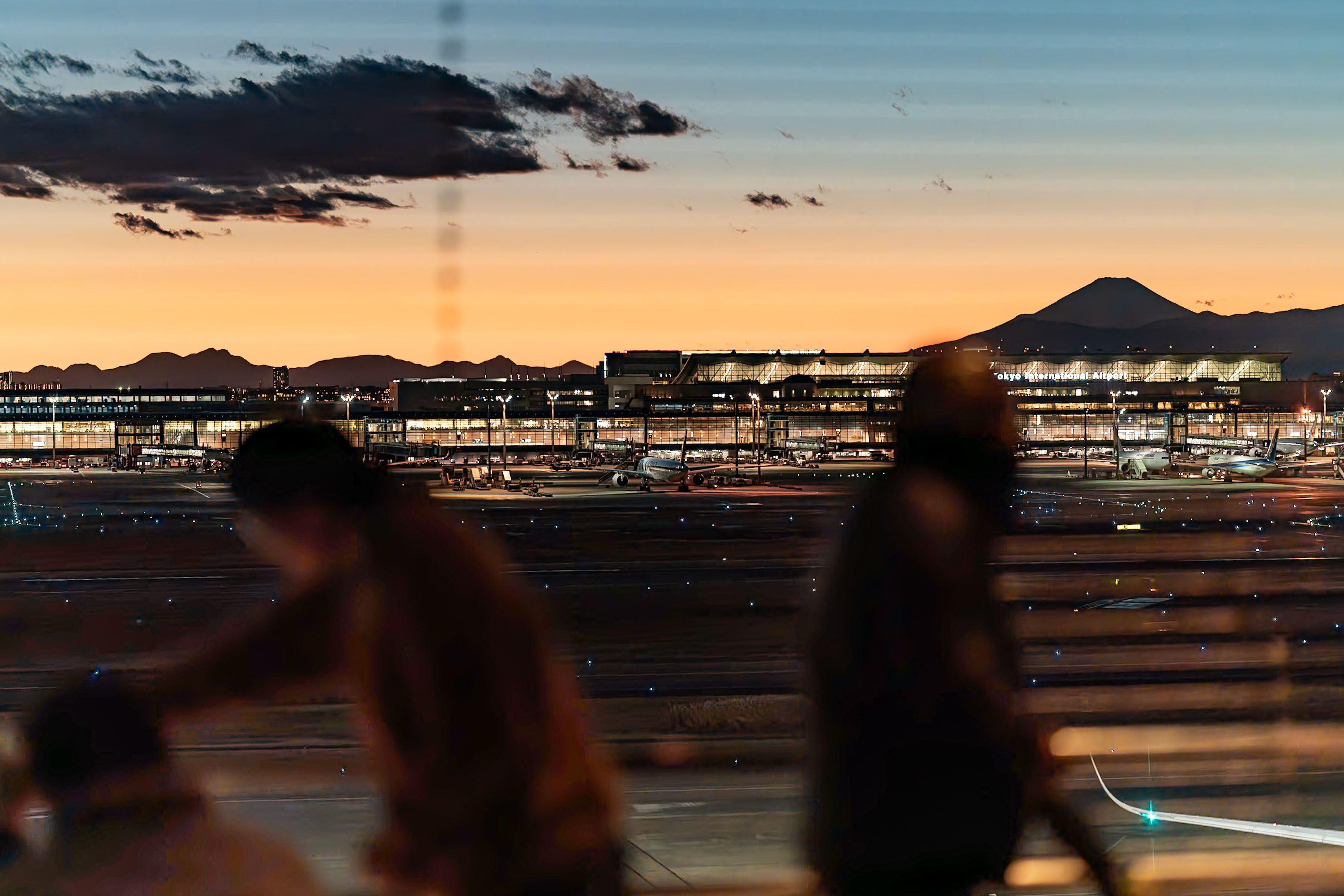 黄昏時の羽田空港と富士山