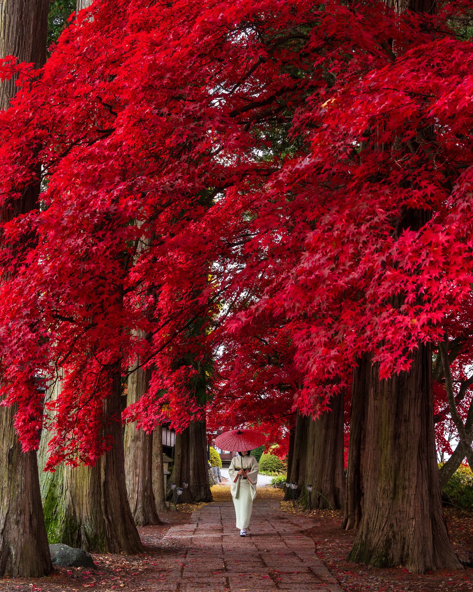真っ赤に染まった楓にタイミングよく訪れることができました。 和服姿を撮影したく同行者に歩いてもらいました。 撮影の順番を待ち許可を得て撮影しております。