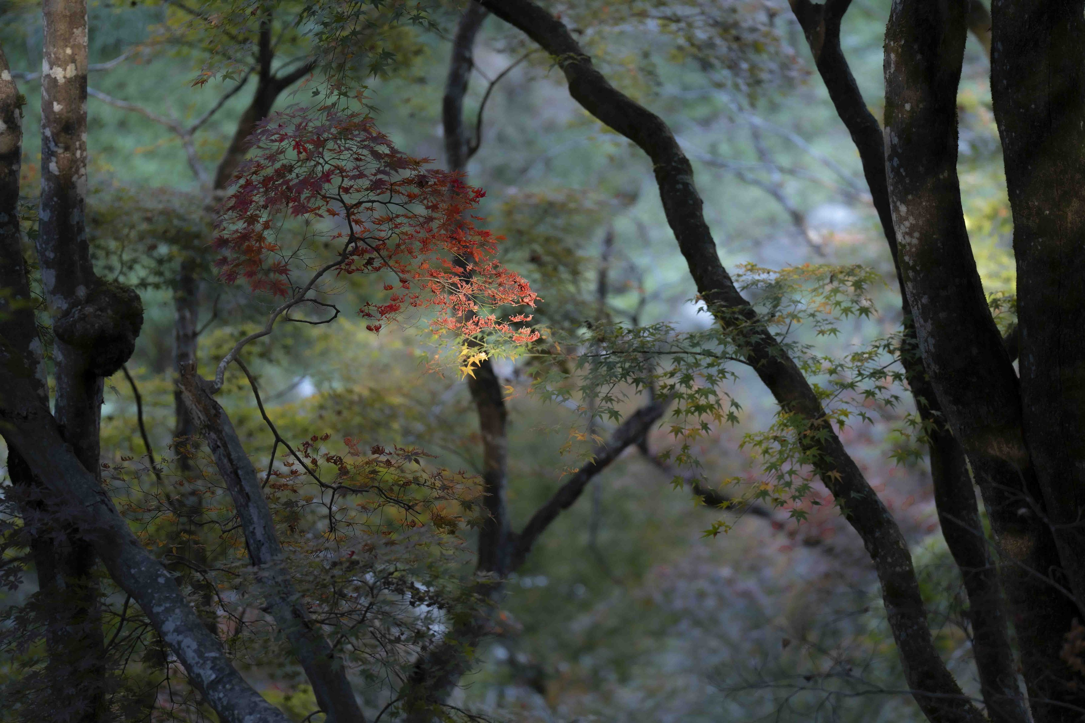薄暗い谷間に一筋光が差し込んでいます。幻想的な絵になりました。