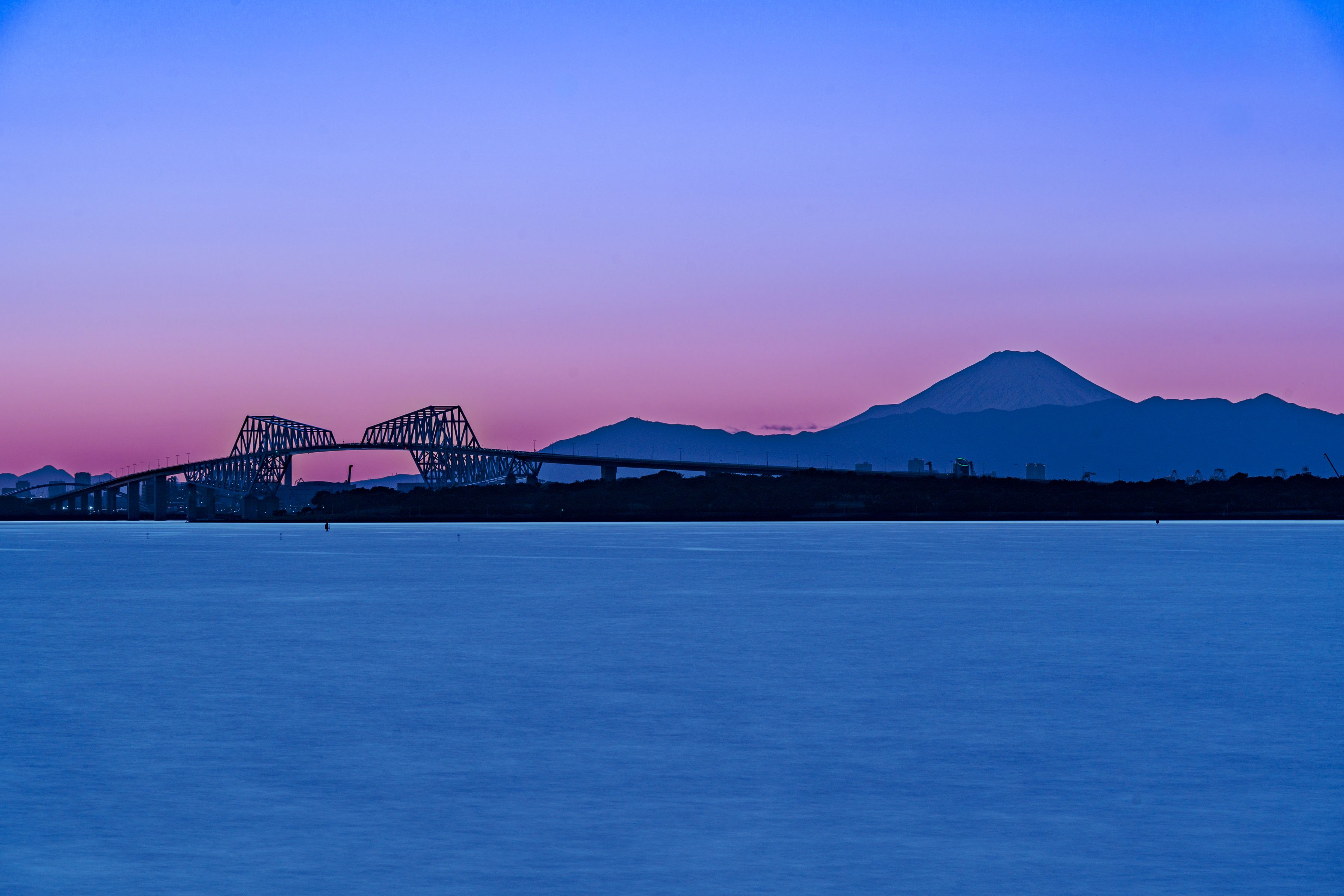 舞浜の遊歩道からの光景です。 思っていたよりも富士山が大きく見えていました。橋と富士山をずらして長時間露光で撮ってみました。 もう少ししたらゲートブリッジがライトアップされてキレイだったのでしょうが、この後に予定があったので次回のお楽しみ。