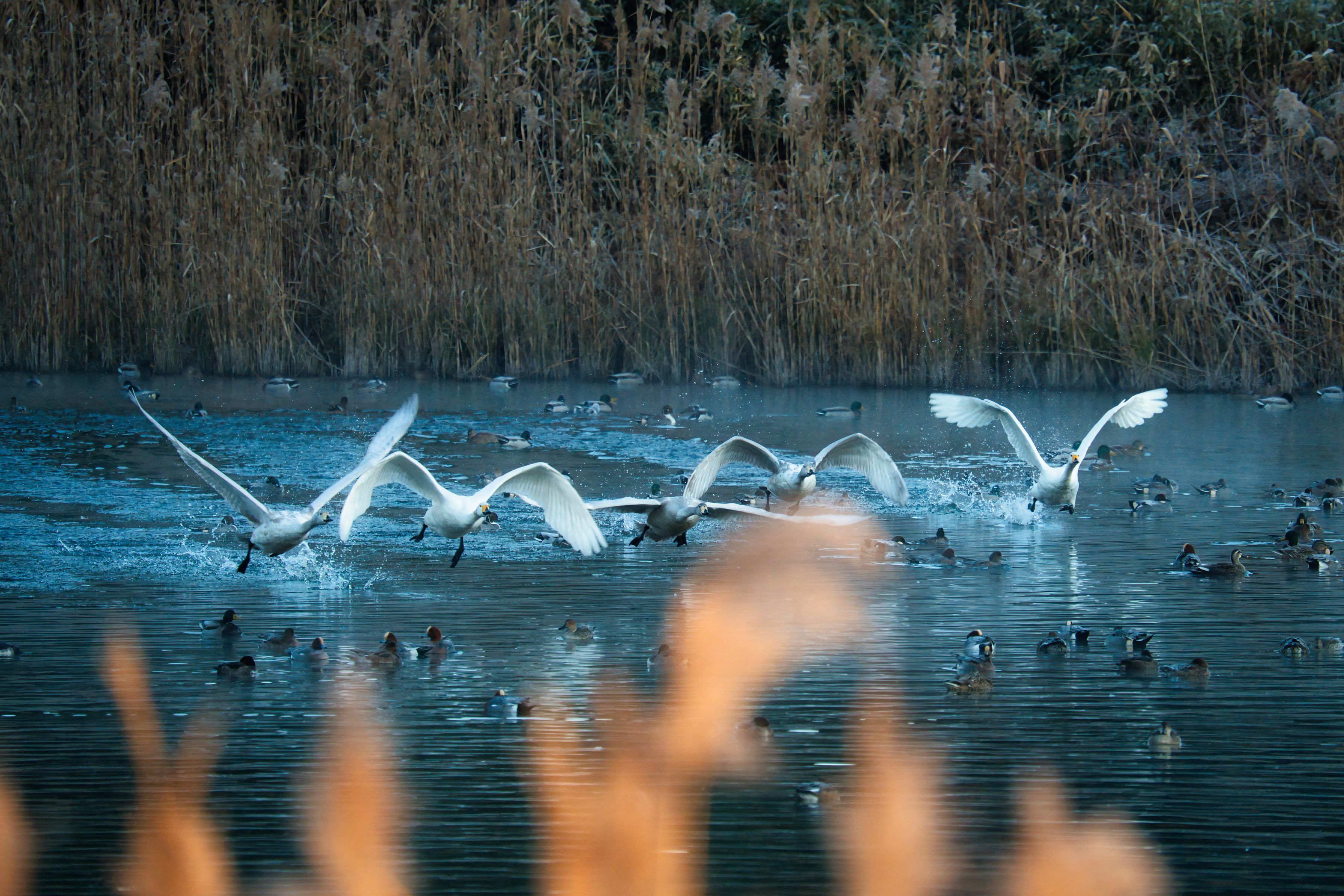この日の朝は-6℃で沼が半分凍っていました。 炎のように踊るヨシを前景に冷たい水の上を助走するシーンが撮れました😊 朝毎に違うベストな構図を探す楽しみ‼️ #オオハクチョウ# 栃木県 大田原市