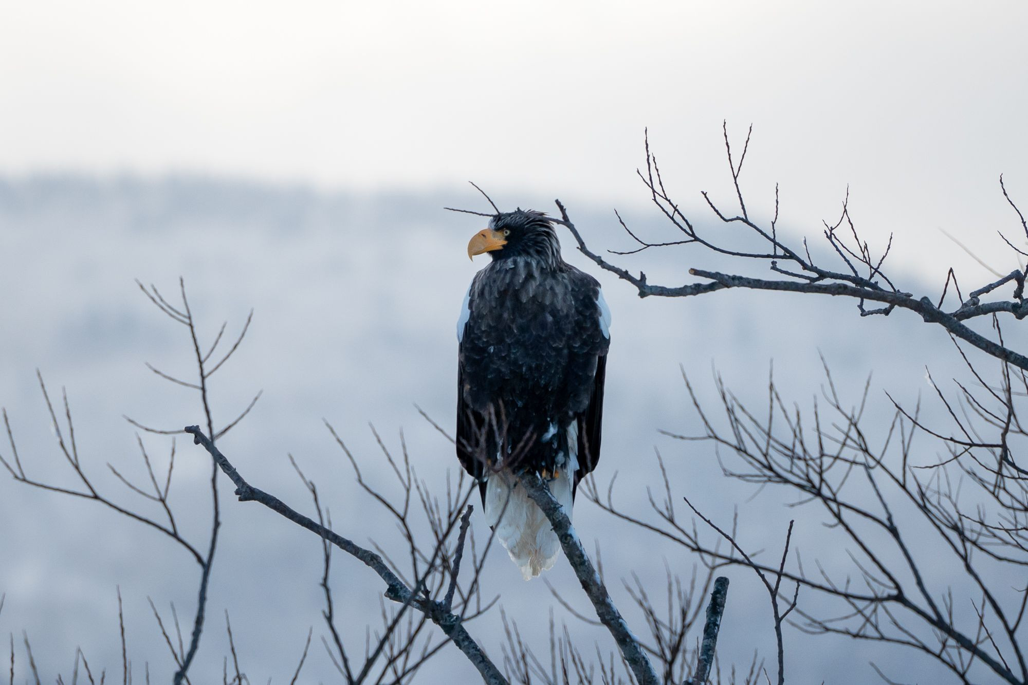 翼を広げると2m以上もある日本最大の猛禽類オオワシさん。少し近づいただけですぐに飛んで行ってしまうほど視力が良いため、「見てないよ~アピール」をしつつ、ジワジワ近づいて撮影しました。