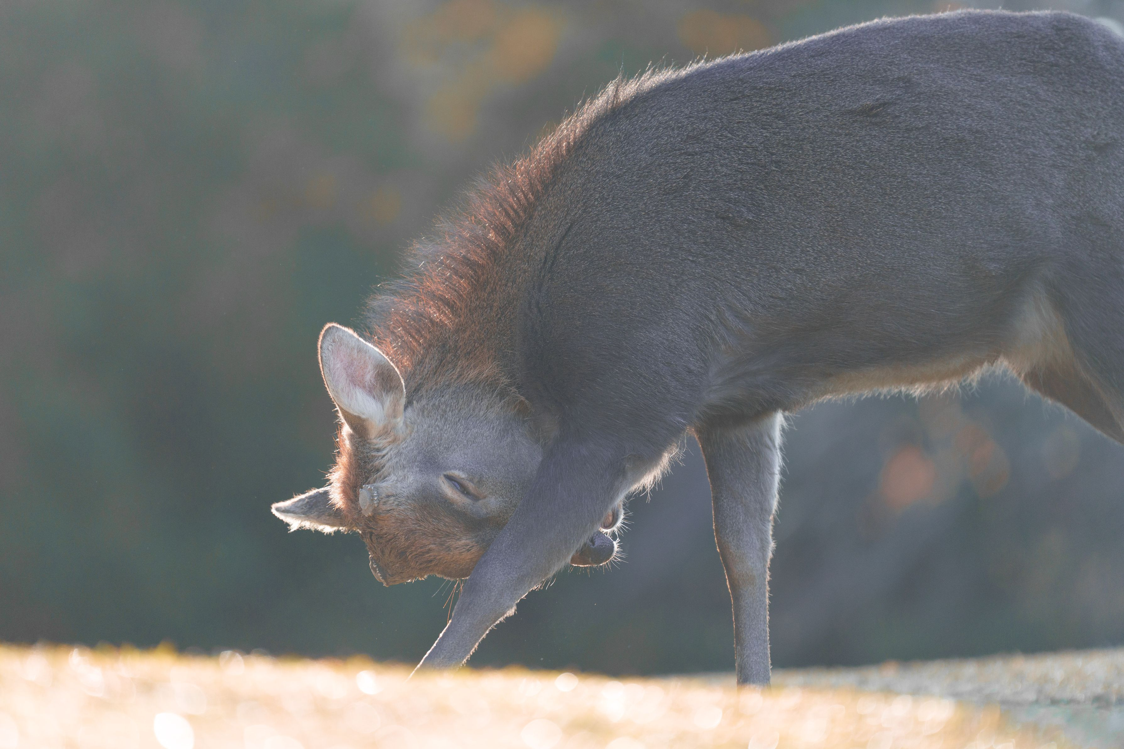 朝日に輝く毛並みがとても綺麗でした。鼻が痒いのでしょうか。早朝の可愛らしい鹿さんの姿です。