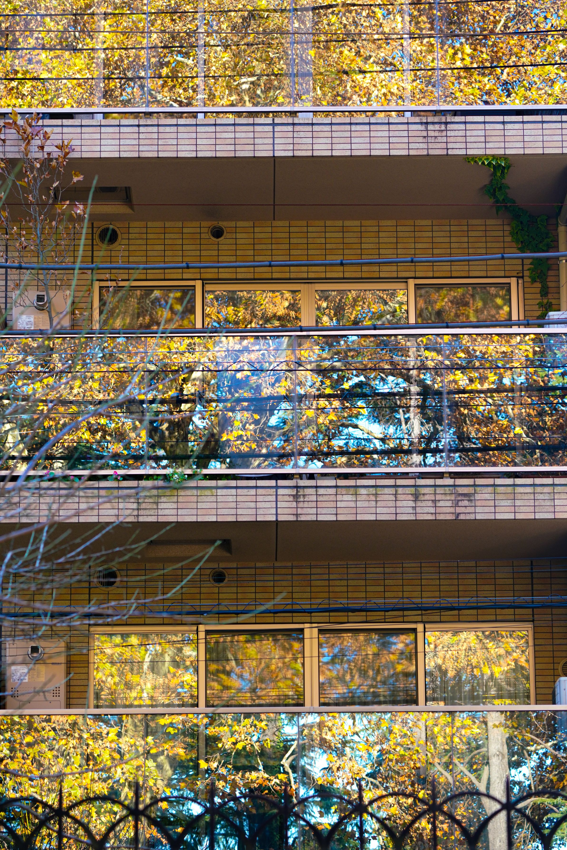 窓ガラスと手すりに映る木々の黄葉が、建物の無機質な表情を温かく彩る。現実と映像が交差し、自然と人工物が調和する瞬間を捉えた作品。光と色彩が織りなす秋の情景は、静けさの中に移ろいゆく季節の詩情を感じさせる。