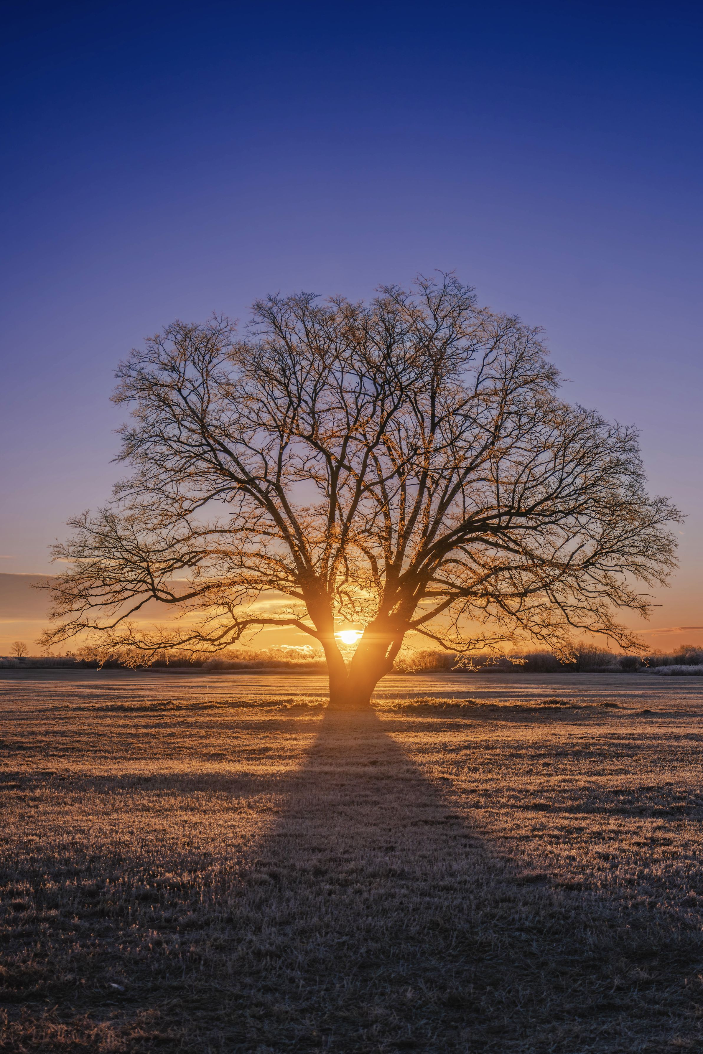 北海道豊頃町の大木「ハルニレの木」 マイナス13度の早朝、枝木の霜が朝日を透かしています。