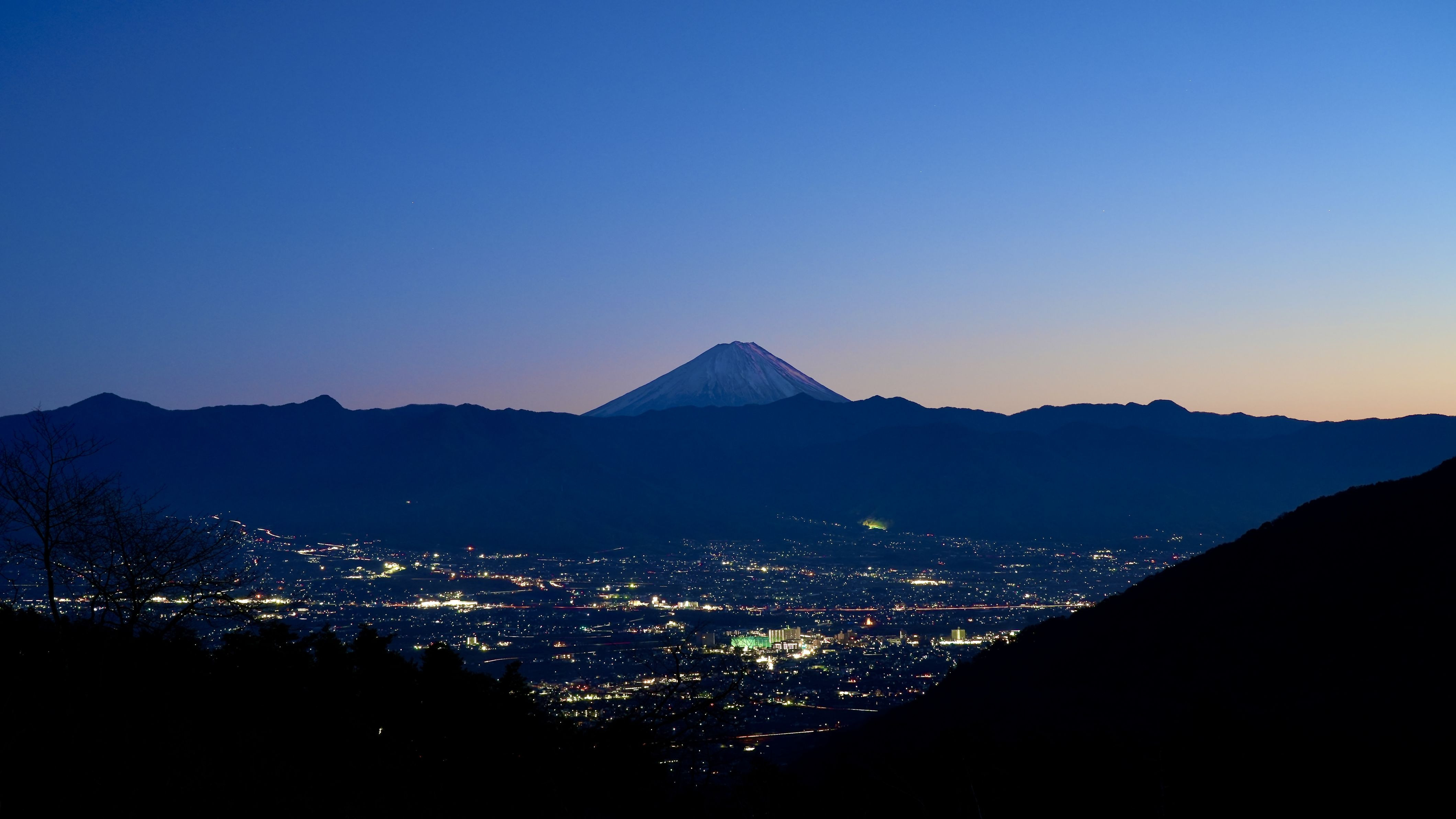 山梨のキャンプ場から撮りました。 富士山が山越しに街を見ているように見えました。