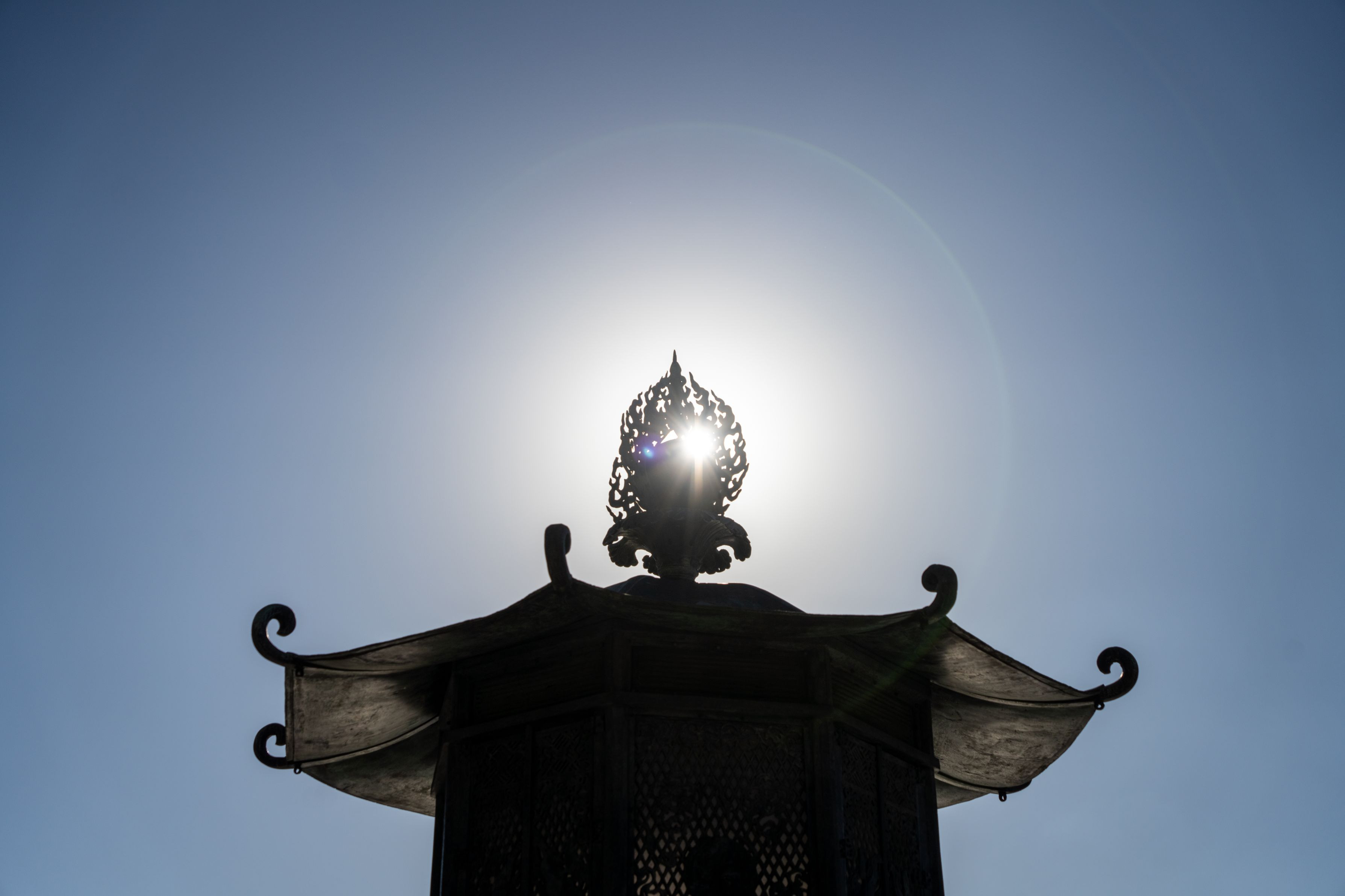 東大寺の八角灯篭。灯篭の上にある「宝珠」に太陽の光があたり、レンズ効果で光輪のように写りました。