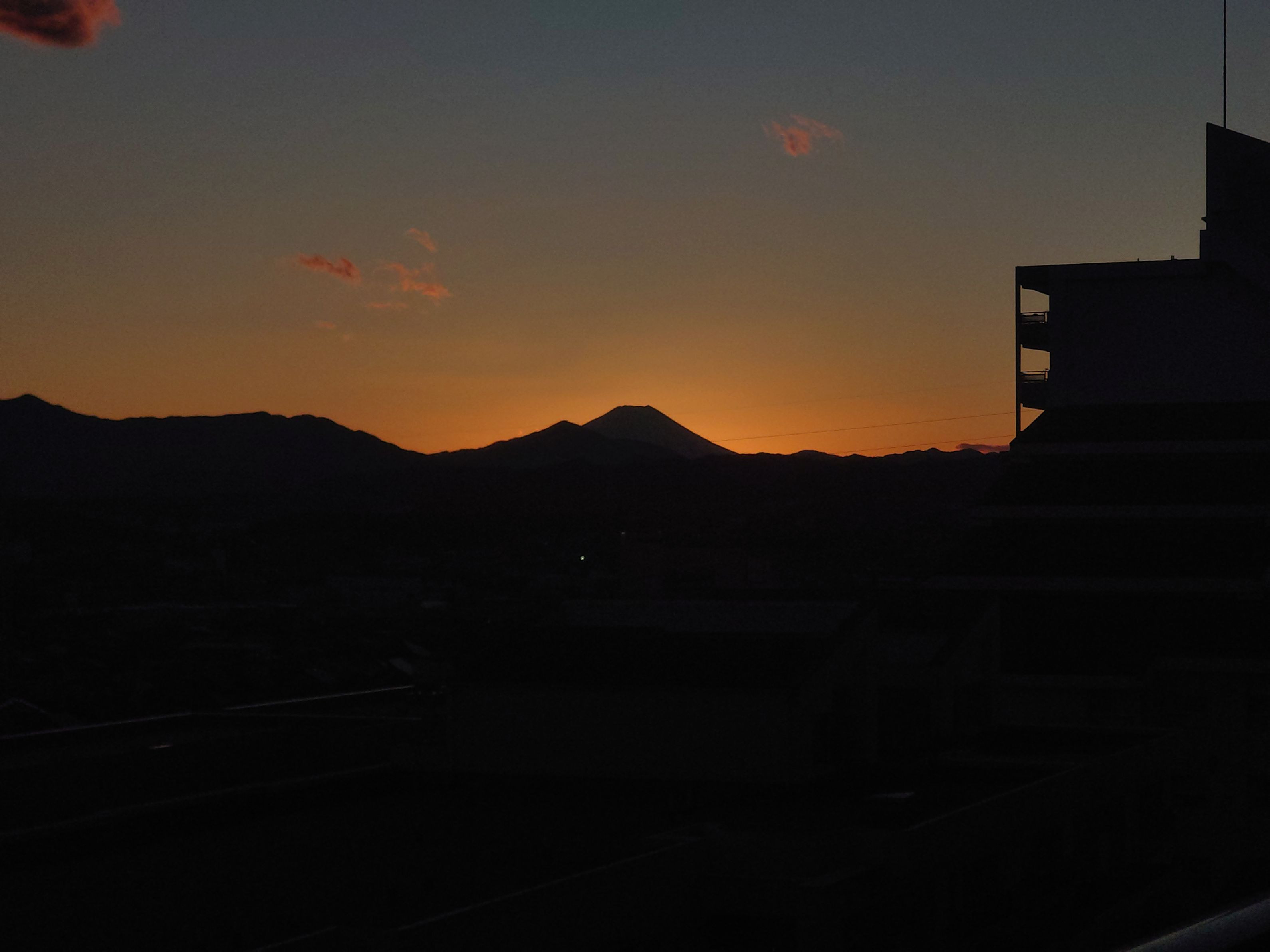 日野市豊田からの夕富士です。冬の時期でないとくっきりとした富士山は見れません。この日は夕陽が富士山方向に沈み、稜線のシルエットを際立たせています。富士山のすぐ横の低い山並みが高尾山になります。際立つ頂上がなく、どこが高尾山なのかいまひとつはっきりしませんが、それが高尾なのです。
