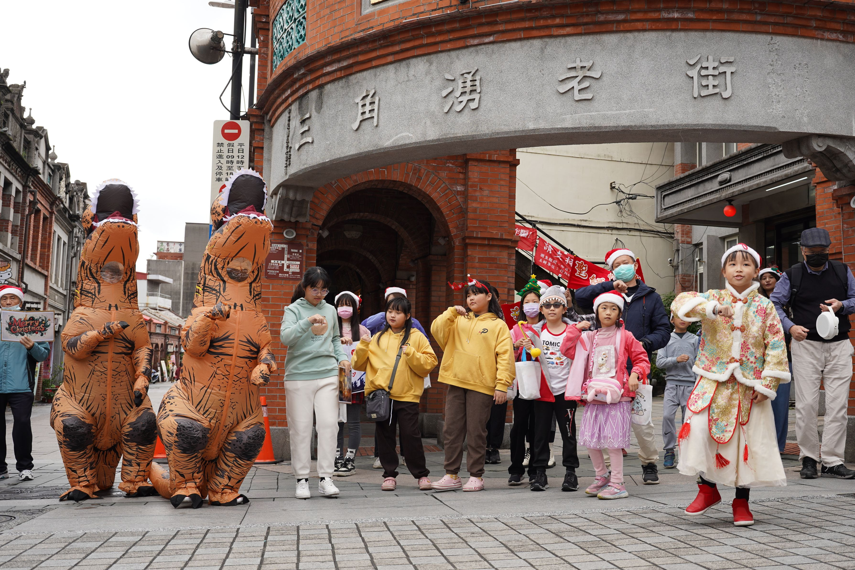 老街の角で大音量のパフォーマンス。 子どもたちは赤い三角帽子をかぶって踊ります。 チャイナ服の子はノリノリです。 なぜか恐竜も2匹。 不思議な取り合わせですが、楽しそう。
