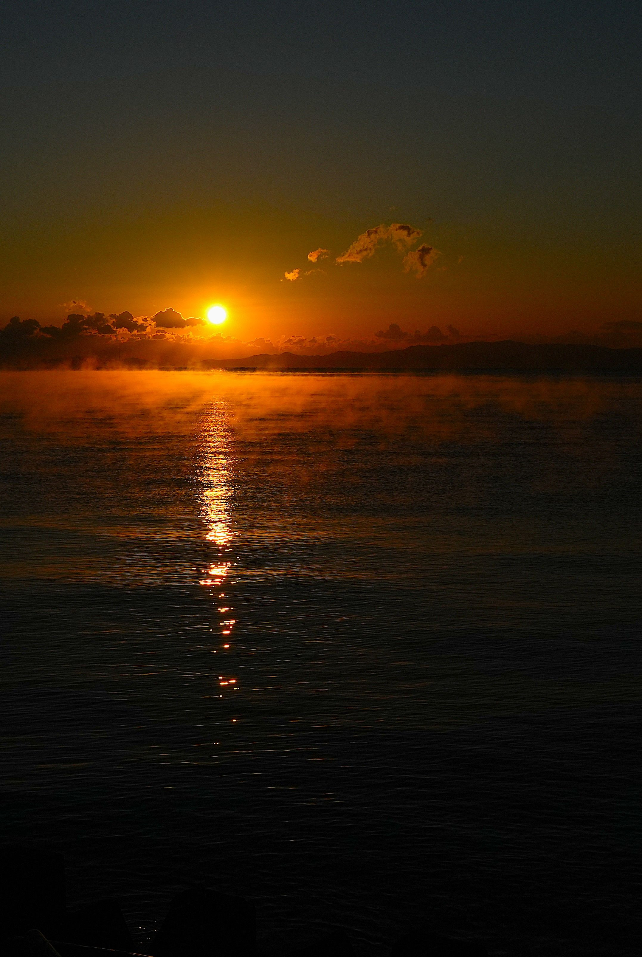 真那井港から佐賀関の日の出を撮影、気温3℃で海面から水蒸気が昇る