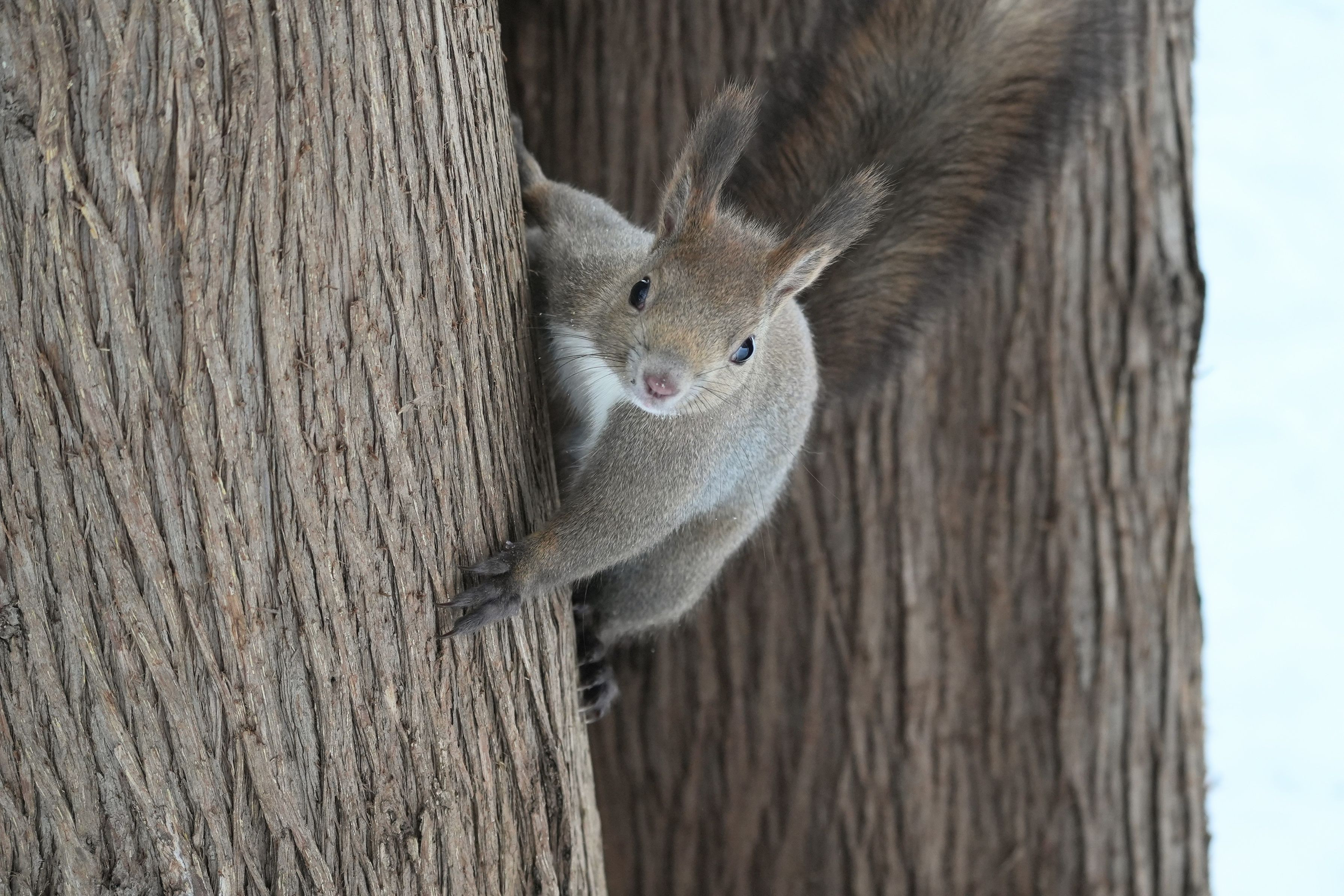 あ、エゾリスちゃん見つけたけど、遠いなぁ、でも取り敢えず何枚か撮っておこうパシャリ。。ってあれ、こっち来そう!来た!素早っ!ちょっと待ってピントが合わない!って更に近くに!ズーム変えて、ってやってたらまたピントが!あれ居ない!どこだよ?あっここ?近すぎ! となった距離の近過ぎるエゾリスです。野生動物と人間には適度な距離感が大事ですよ