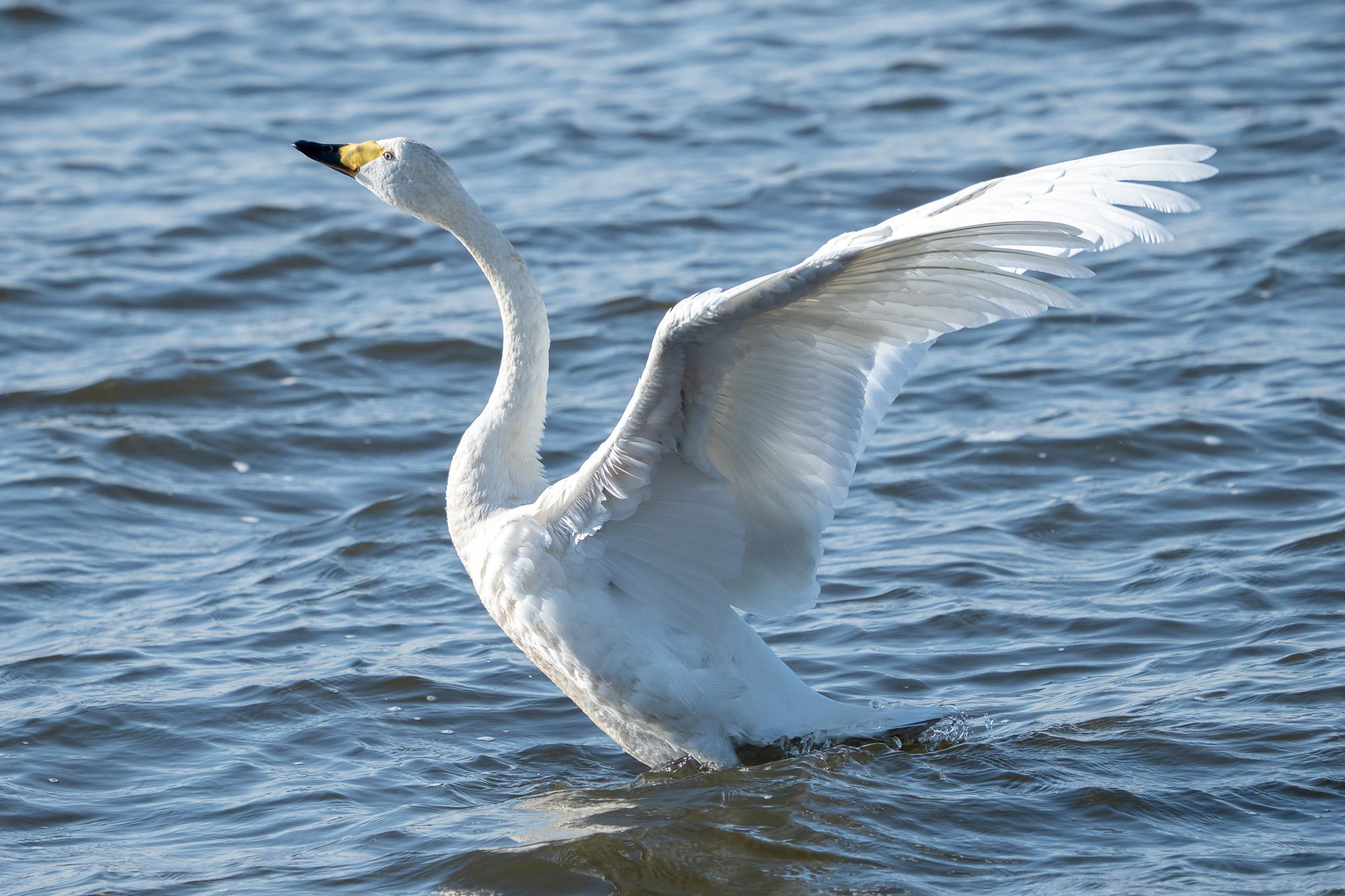 太陽に向かって大きな翼を広げているコハクチョウさん。
