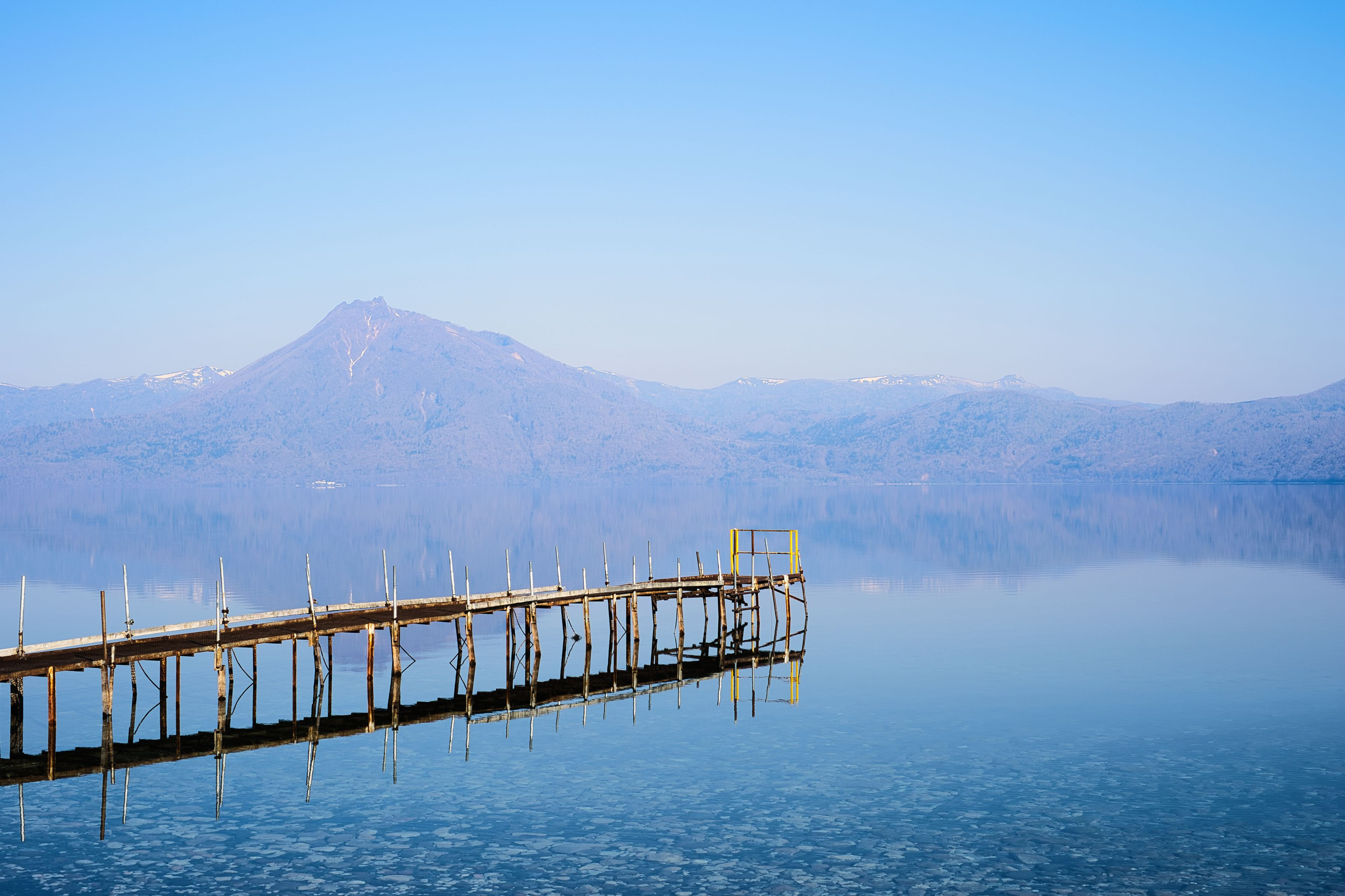 支笏湖の朝 快晴な空と透き通った水に反射する桟橋が印象的でした。 湖面の青さと空の青さのグラデーションを意識し撮影しました。