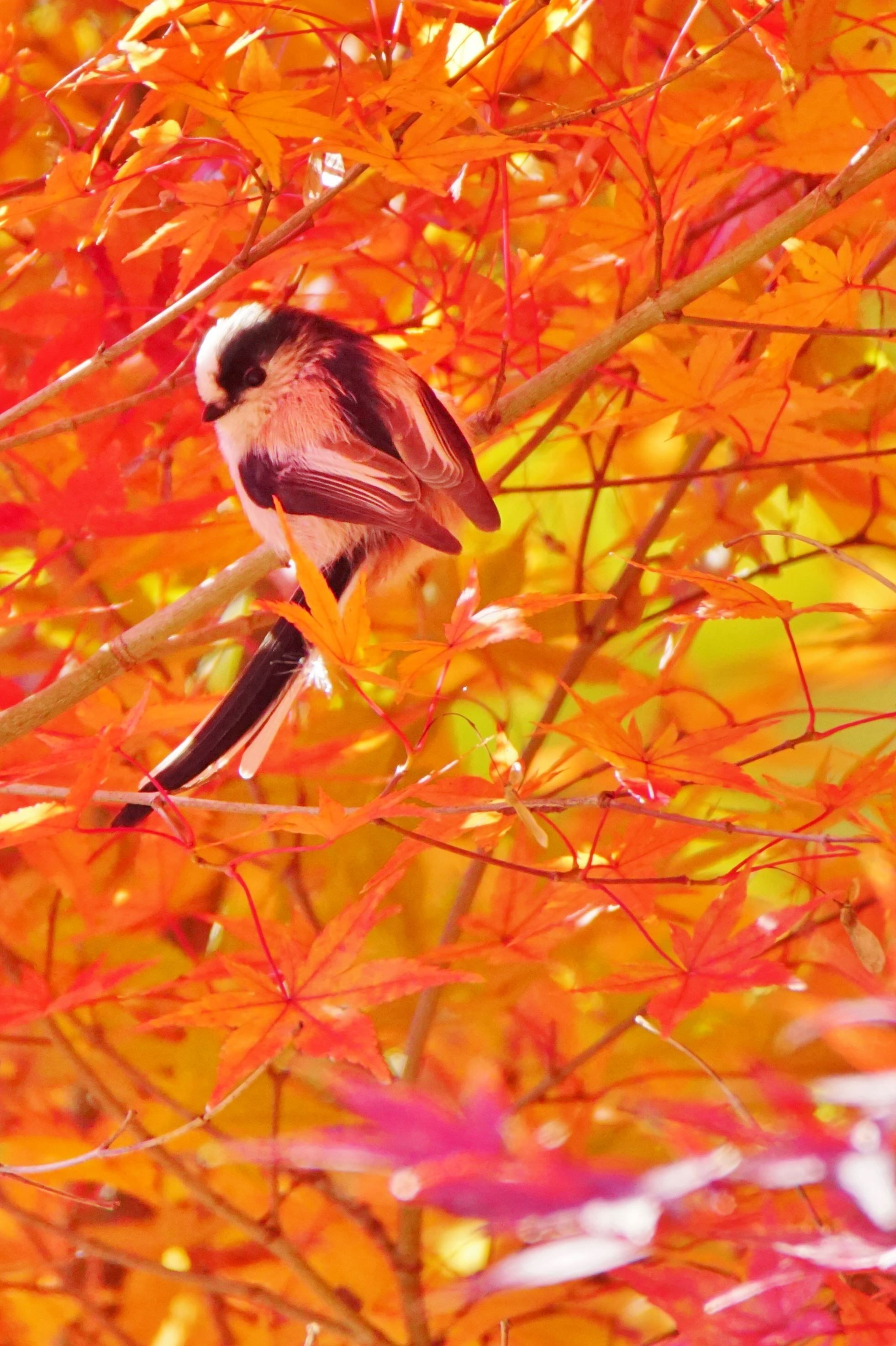 ちょうど紅葉している木にエナガが止まって振り返ってくれました。羽が腕に見えて、いらっしゃいませ~って言ってるように見えませんか😉