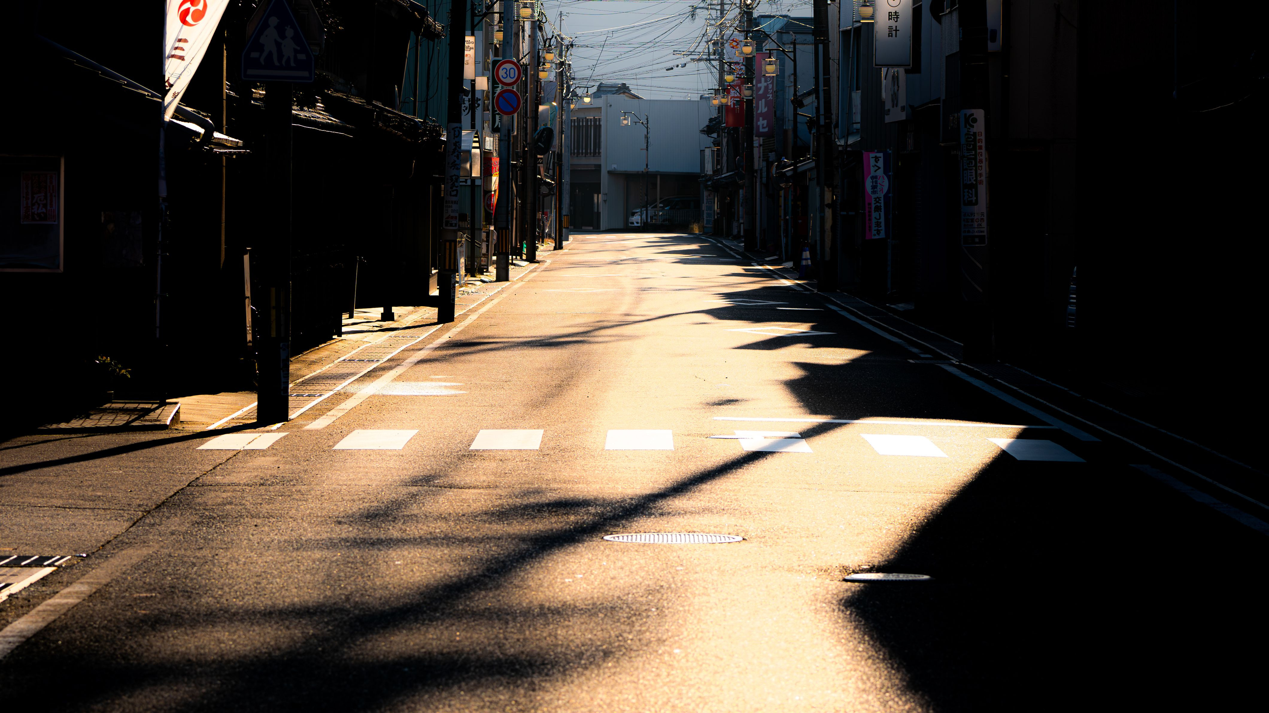 元旦、朝日に照らされた町筋。先の投稿写真は西方向。これは東方向。自動補正後ハイライトを上げ、シャドーとブラックを下げた。