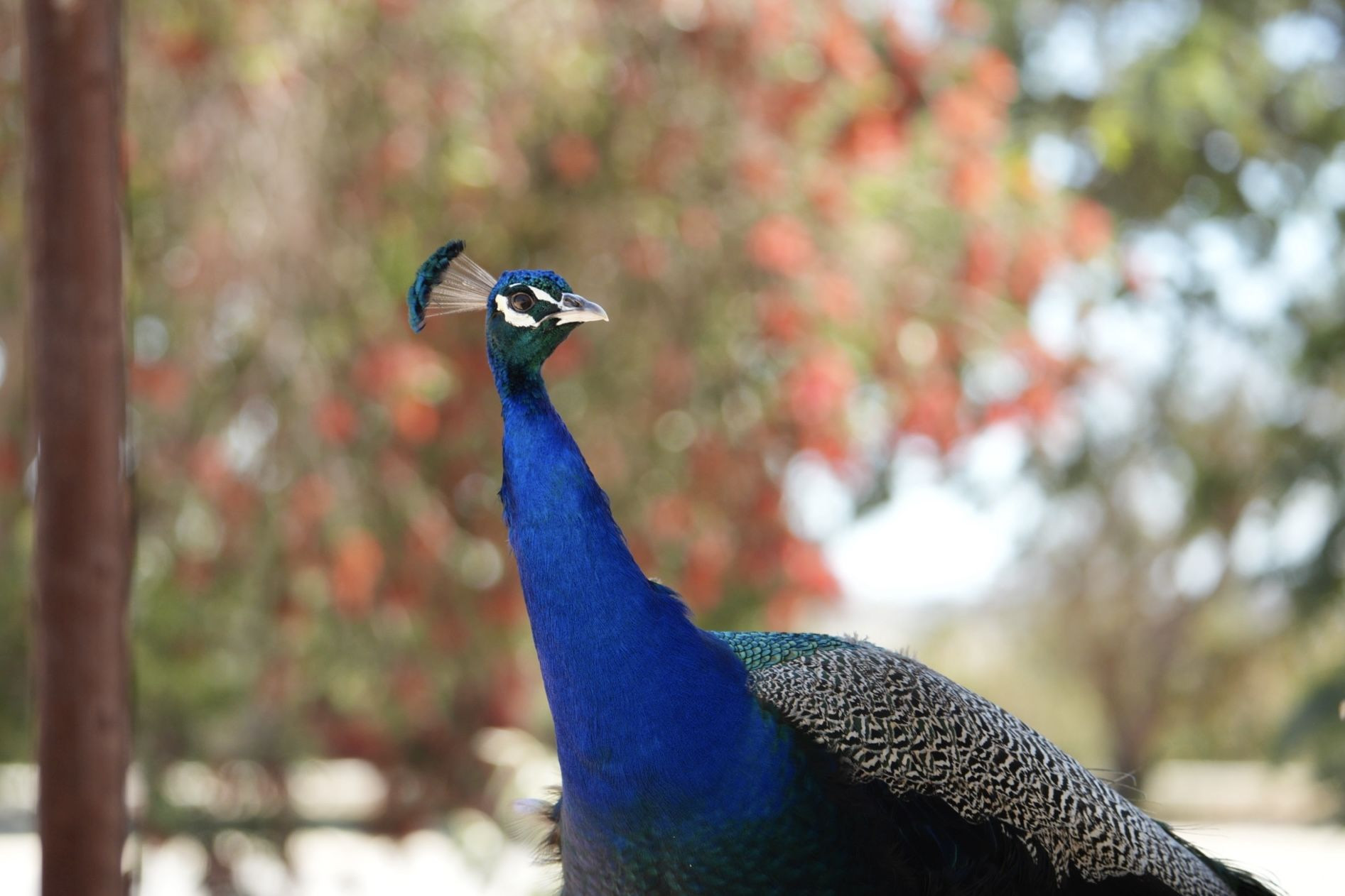 野生のインドクジャクをガソリンスタンドでみつけました 背景の赤いワイルドフラワーはブラシの木かな