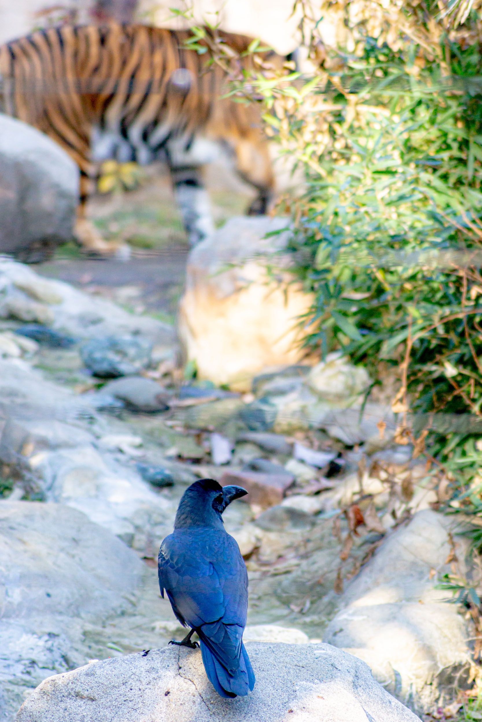 とある動物園での「トラの檻にいるカラス」。カラスからすれば余裕ですわなw