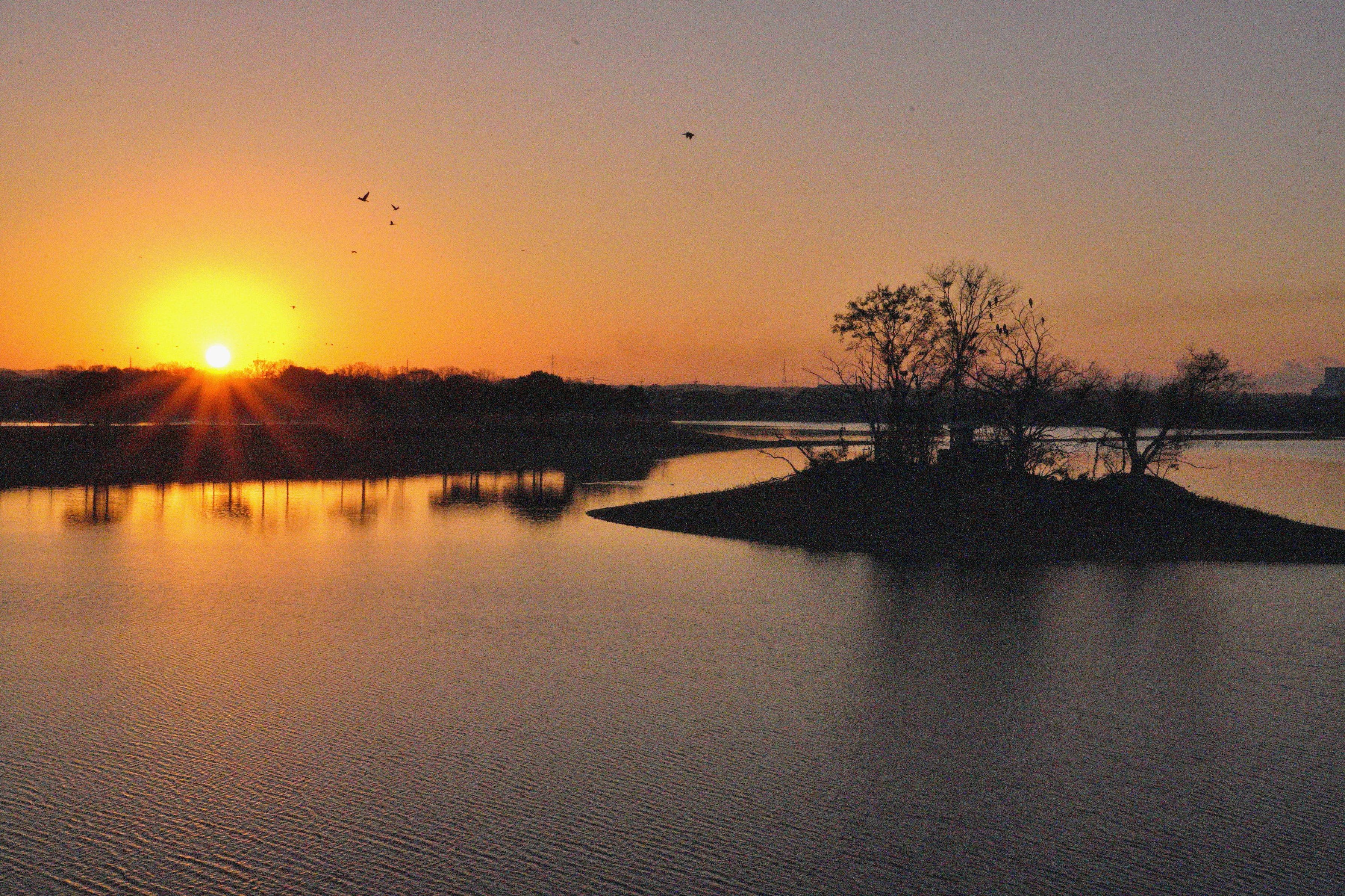 兵庫県No1の大きさを誇りにしている人工農業用池の「加古大池」 今年はこの大池に浮かぶ浮島を中心に、じっくり昇ってくる日の出を快晴の予報に合わせて早朝から狙った。満水時は甲子園球場が12個も入る大きさになる。