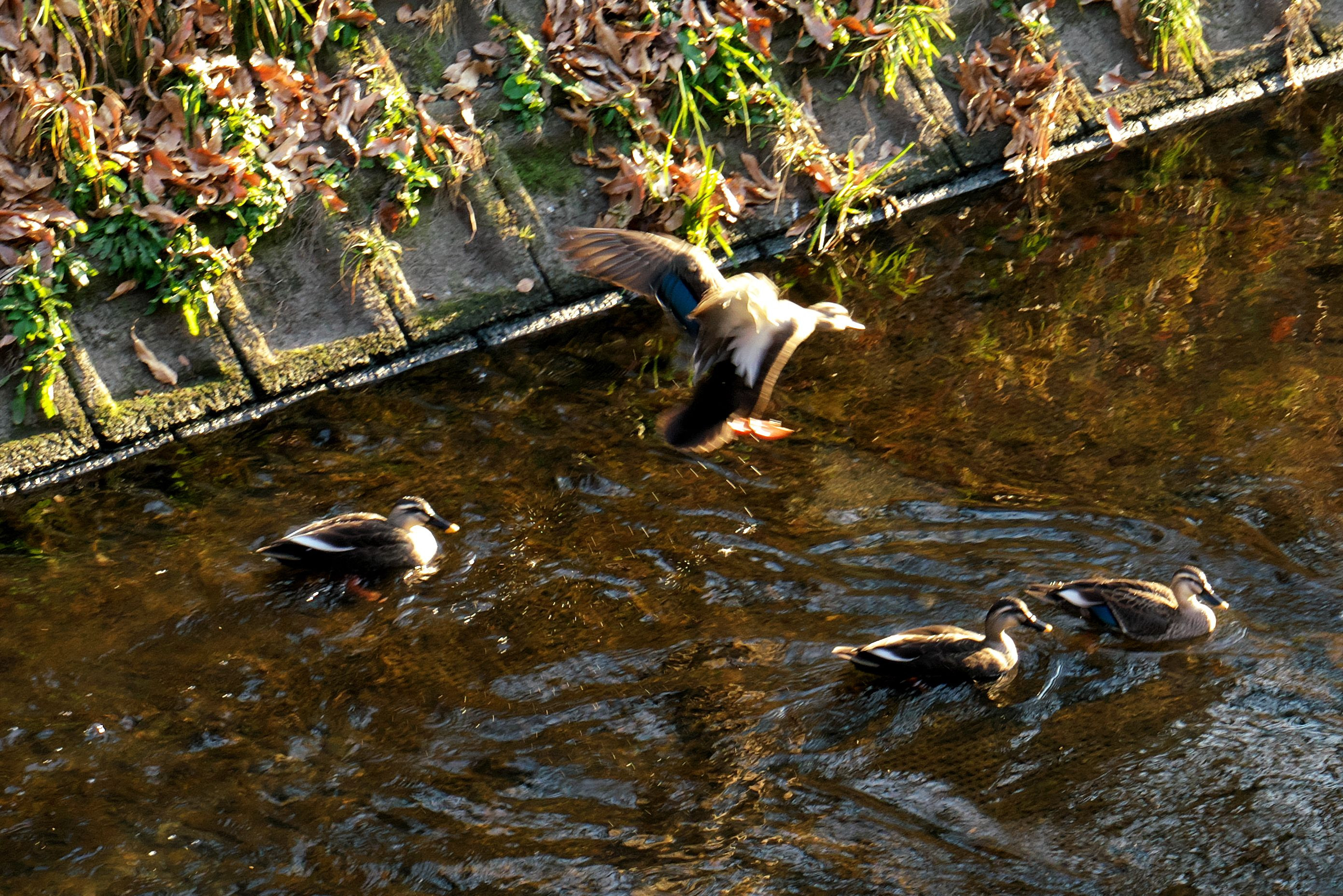 散歩コースの用水路にはカルガモ一家が子育てをしています。 今日も一家でまとまって泳いでいました。私がカメラを持って近づいたことに注意しろってことか一羽が飛び上がりました。すぐに降りて来ましたが、一家の様子和気あいあいとしている様子でした。