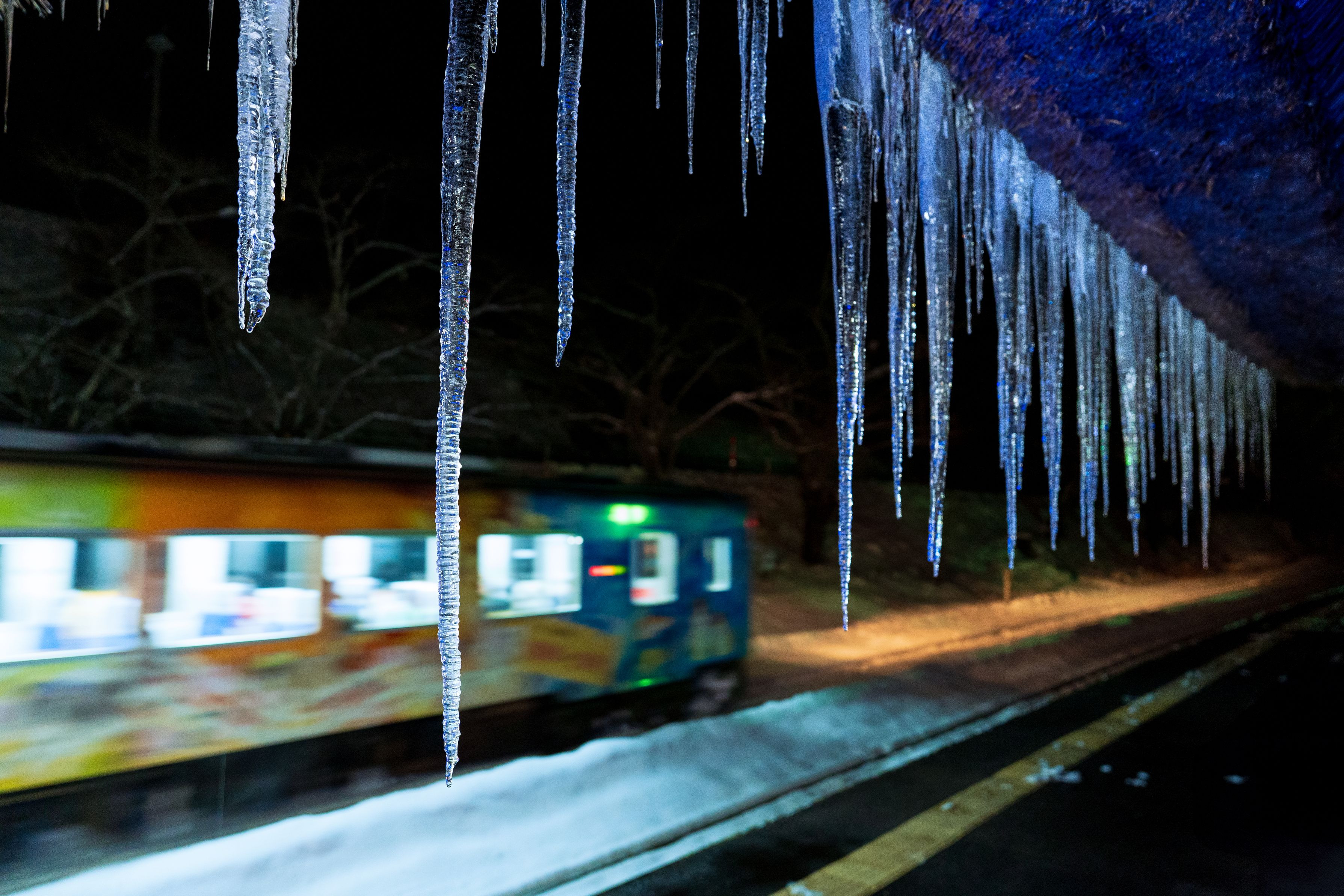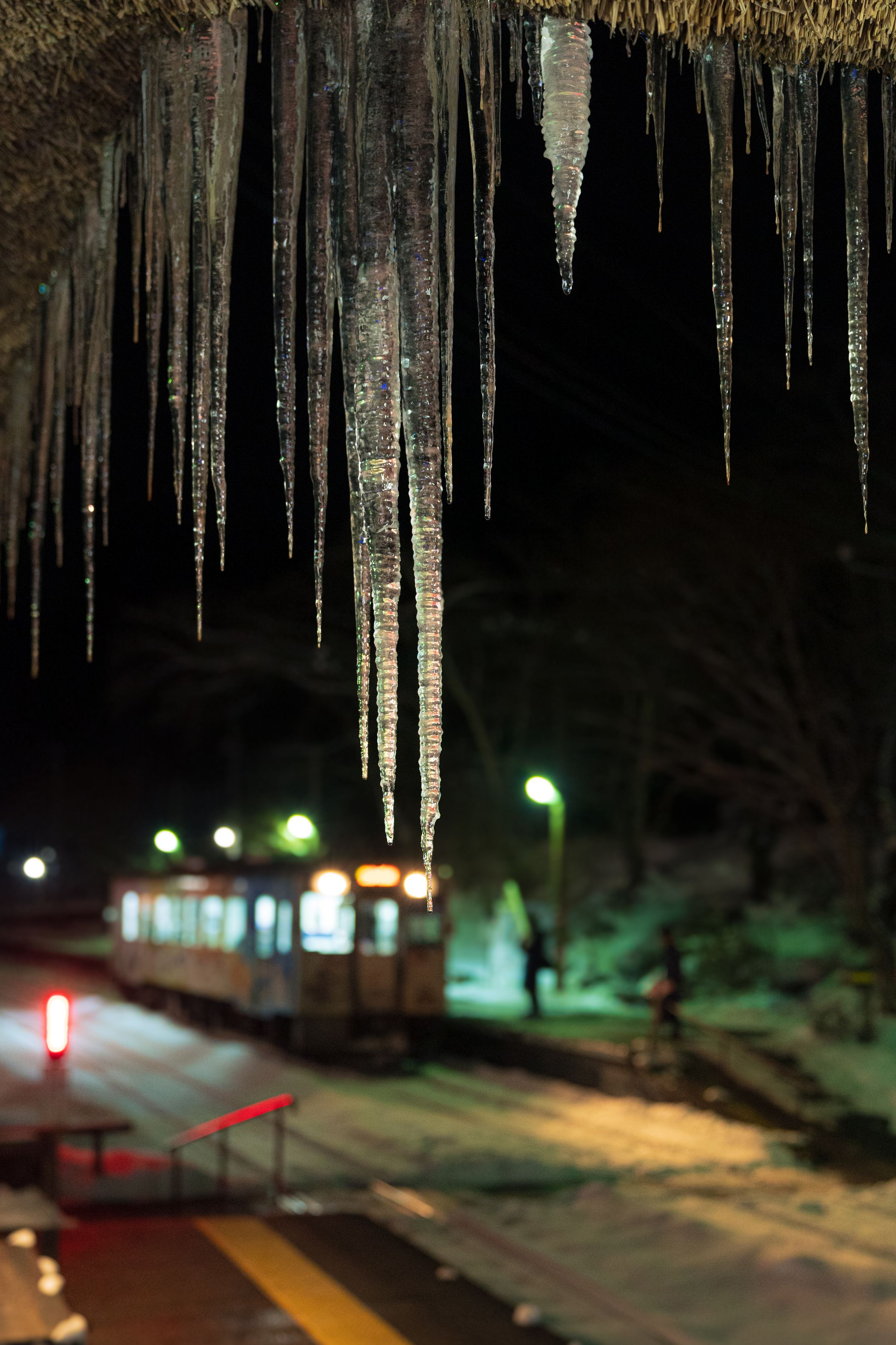 少し冬が感じられる写真を。。 つららと列車を一緒に撮ってみました^^ 会津鉄道・湯野上温泉駅で。