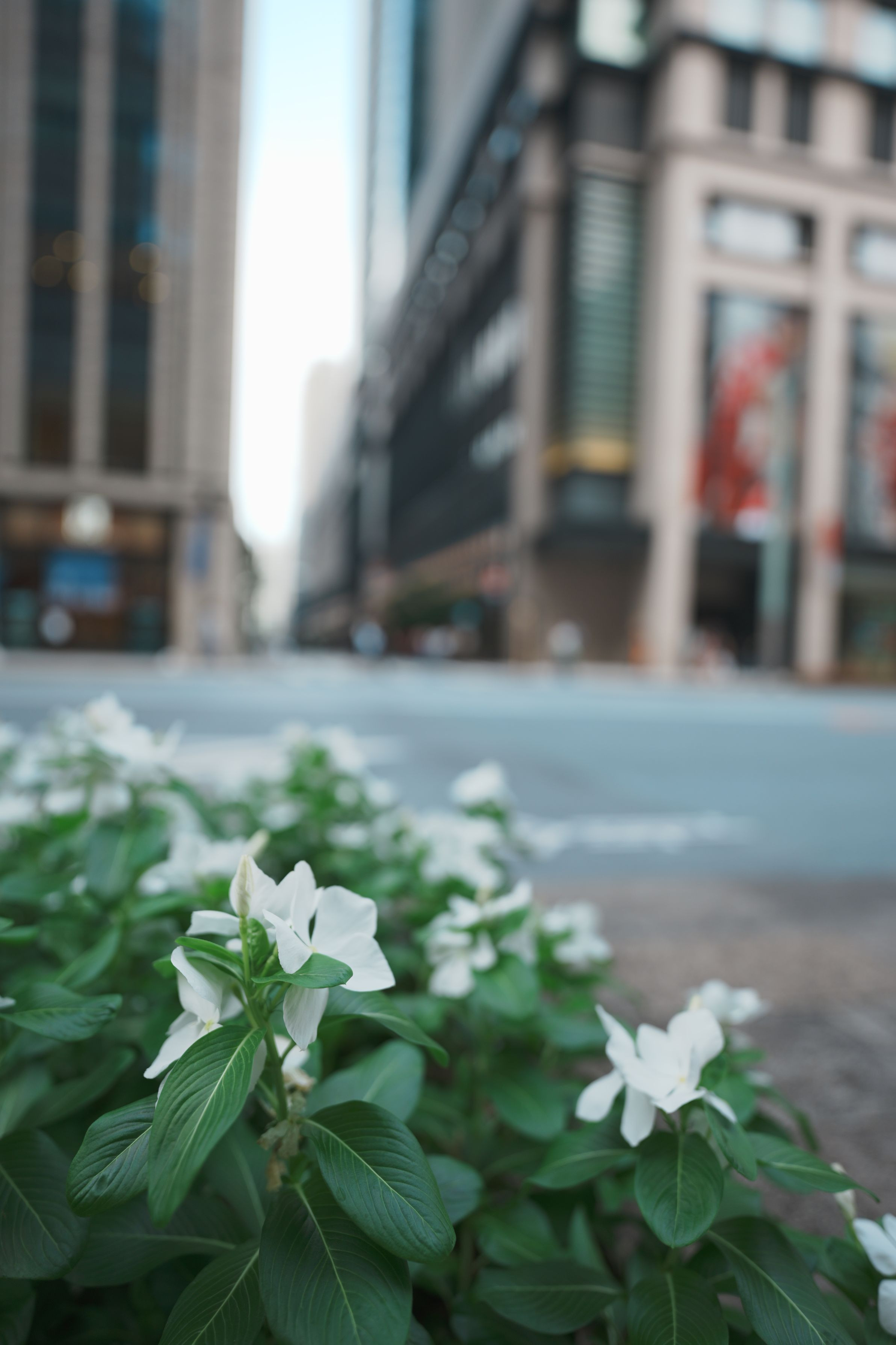 日本橋の路肩、都会の空気で暗色に育った緑から歪(いびつ)に開いたオフホワイトがコンクリートジャングルを飾っている様が画になったので明るさ彩度をそのままに。