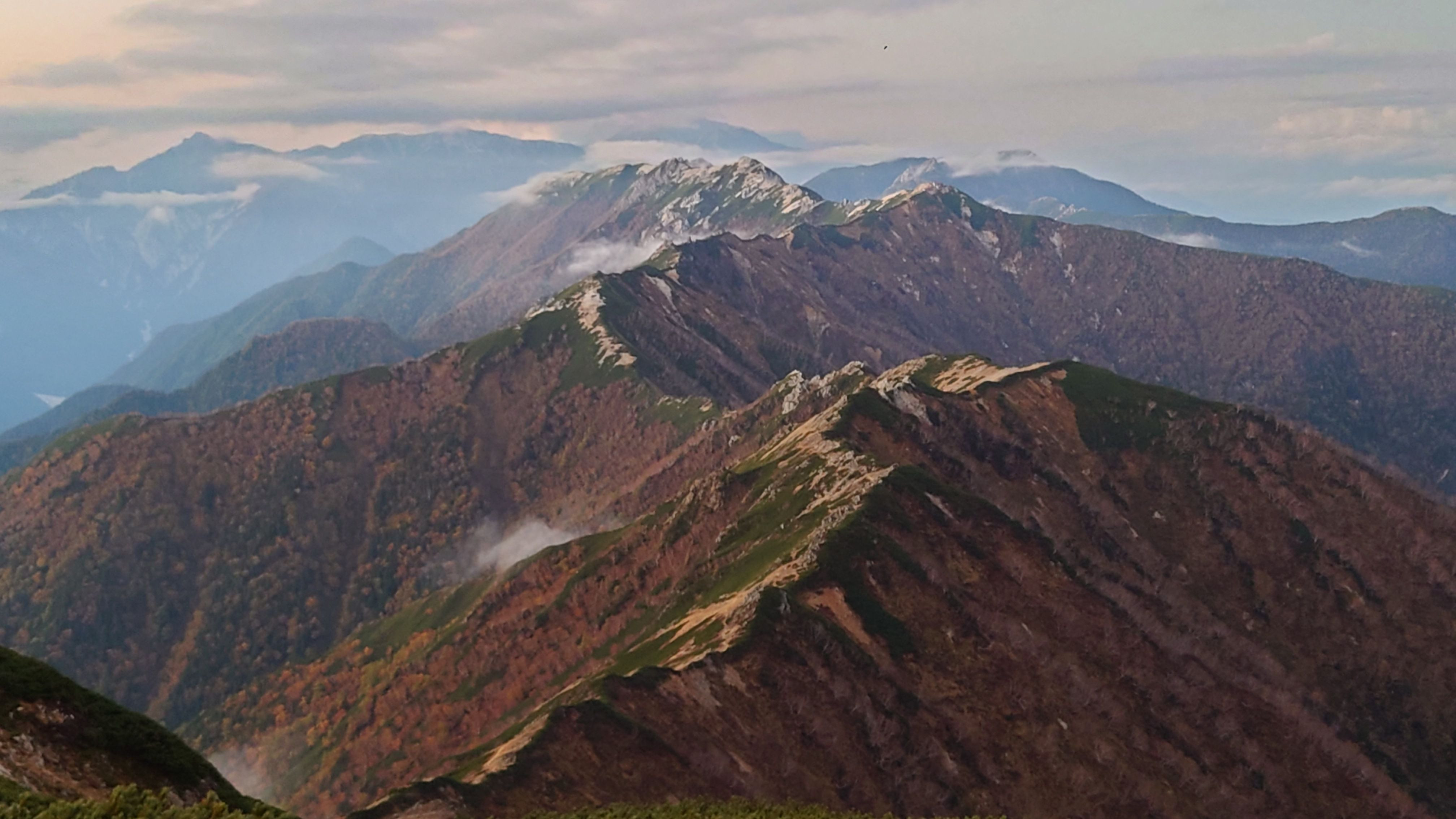2024.10.12 雨の中辿りついた大天井岳。雨上がりを待って山頂に行くと、さっき歩いたばかりの表銀座稜線が秋の終わりを告げていたように見えた1枚