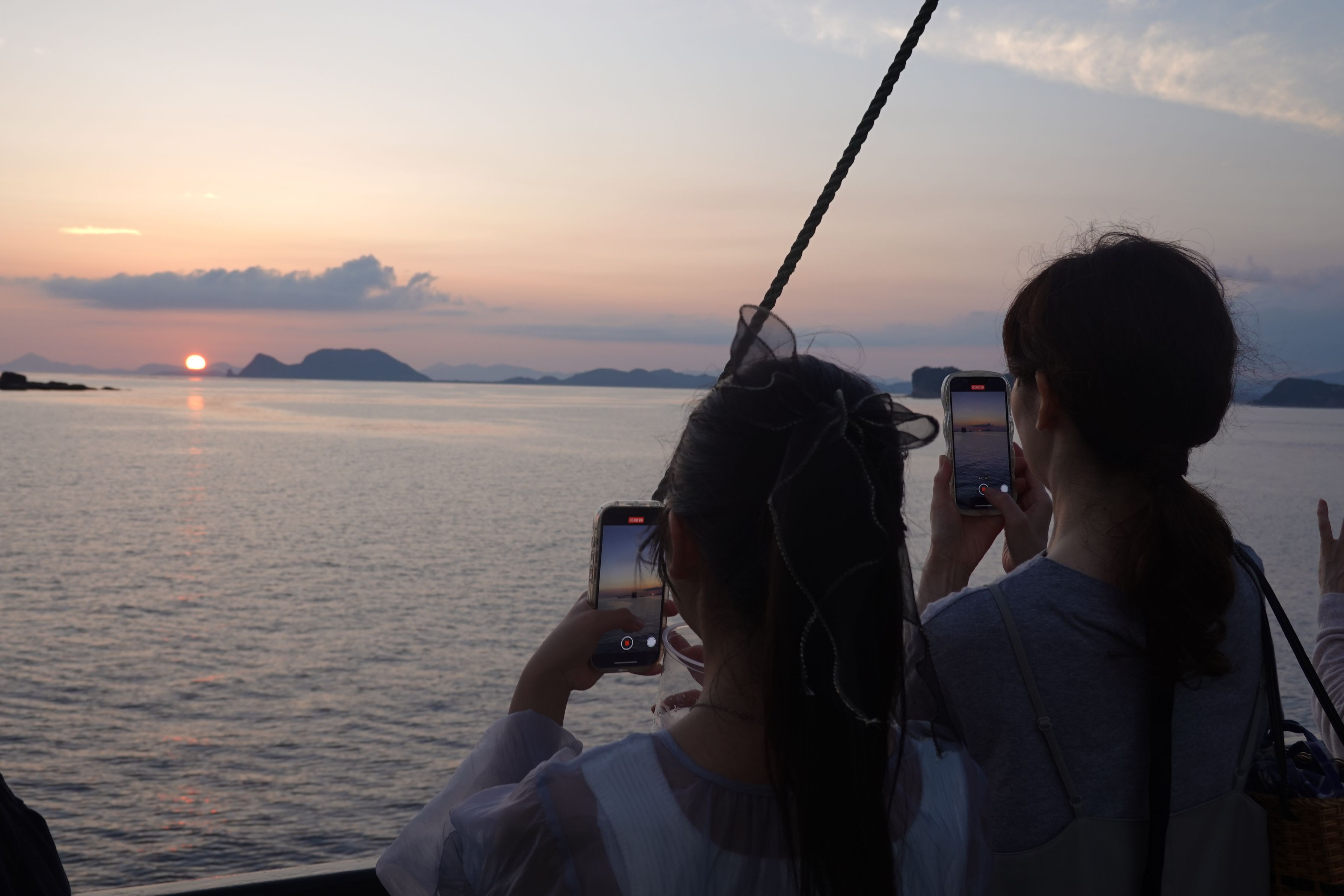 家族旅行の一コマ サンセットクルーズでの夕焼けは圧巻でした 撮影に夢中です オレンジ色の夕焼けは明日も晴れだよ~!