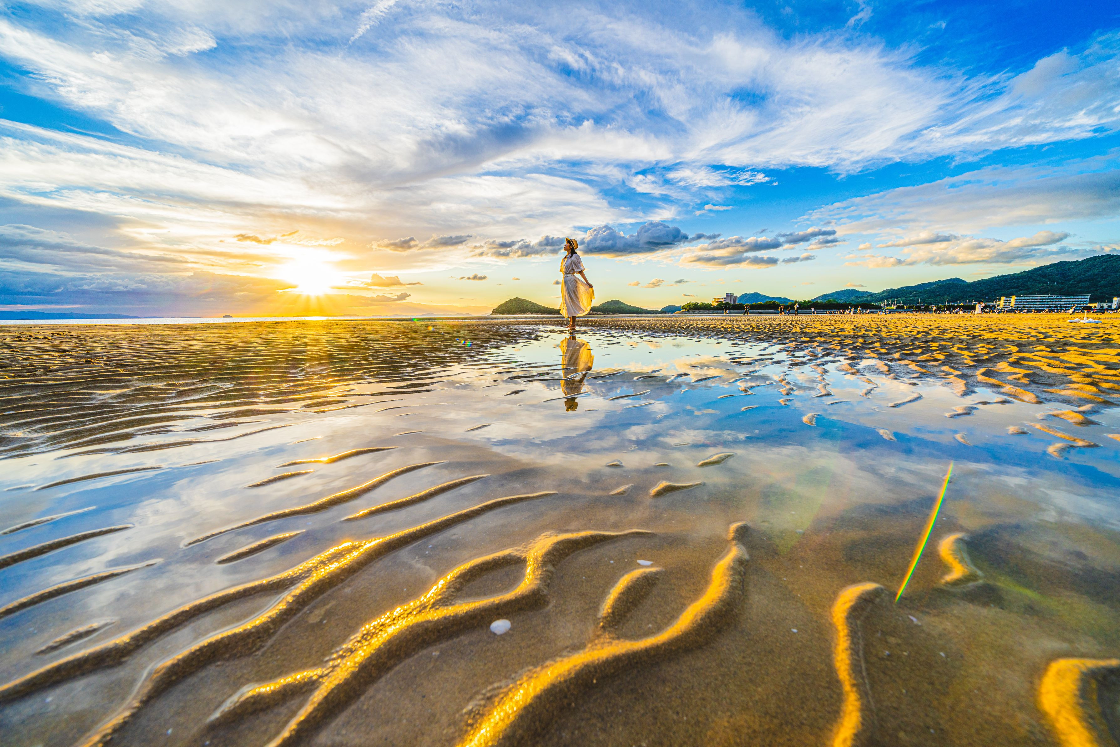 香川県三豊市にある父母ヶ浜での一コマ。美しい夕焼けと美しい砂浜の砂紋、リフレクション。身近にある絶景。
