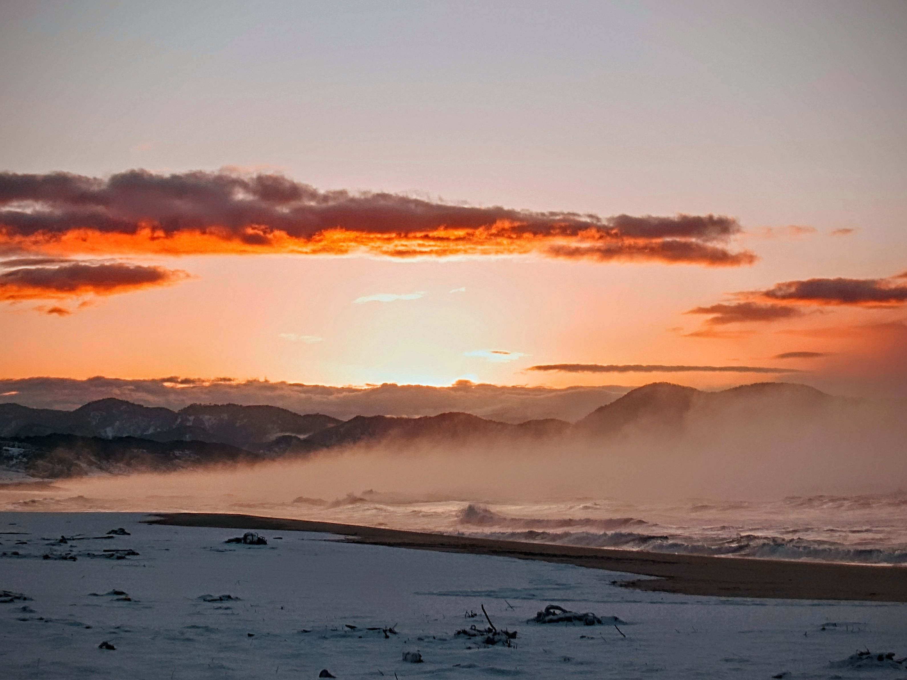 夕日ヶ浦。夕陽と夕焼けで有名なとこ。 積雪の翌日の夕焼け。遠浅の浜辺に波が入ると水蒸気で水煙がたって幻想的でした✨