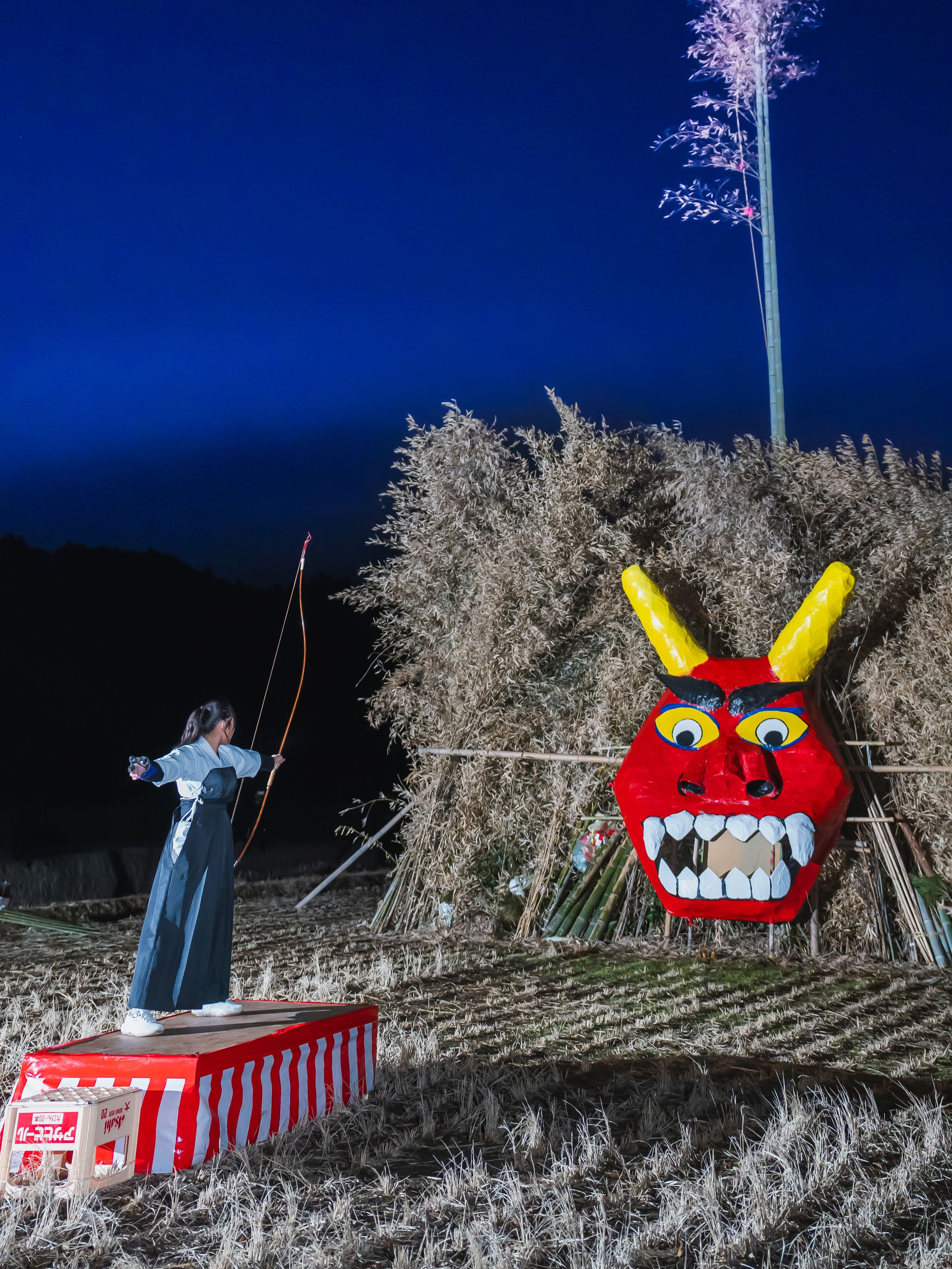 鹿児島では正月7日に大やぐらを焼いて、正月飾りについた悪霊(鬼)を追い払う鹿児島の伝統行事。 参加者は燃えさかる炎を前に、一年間の無病息災、家内安全などを祈願していました。