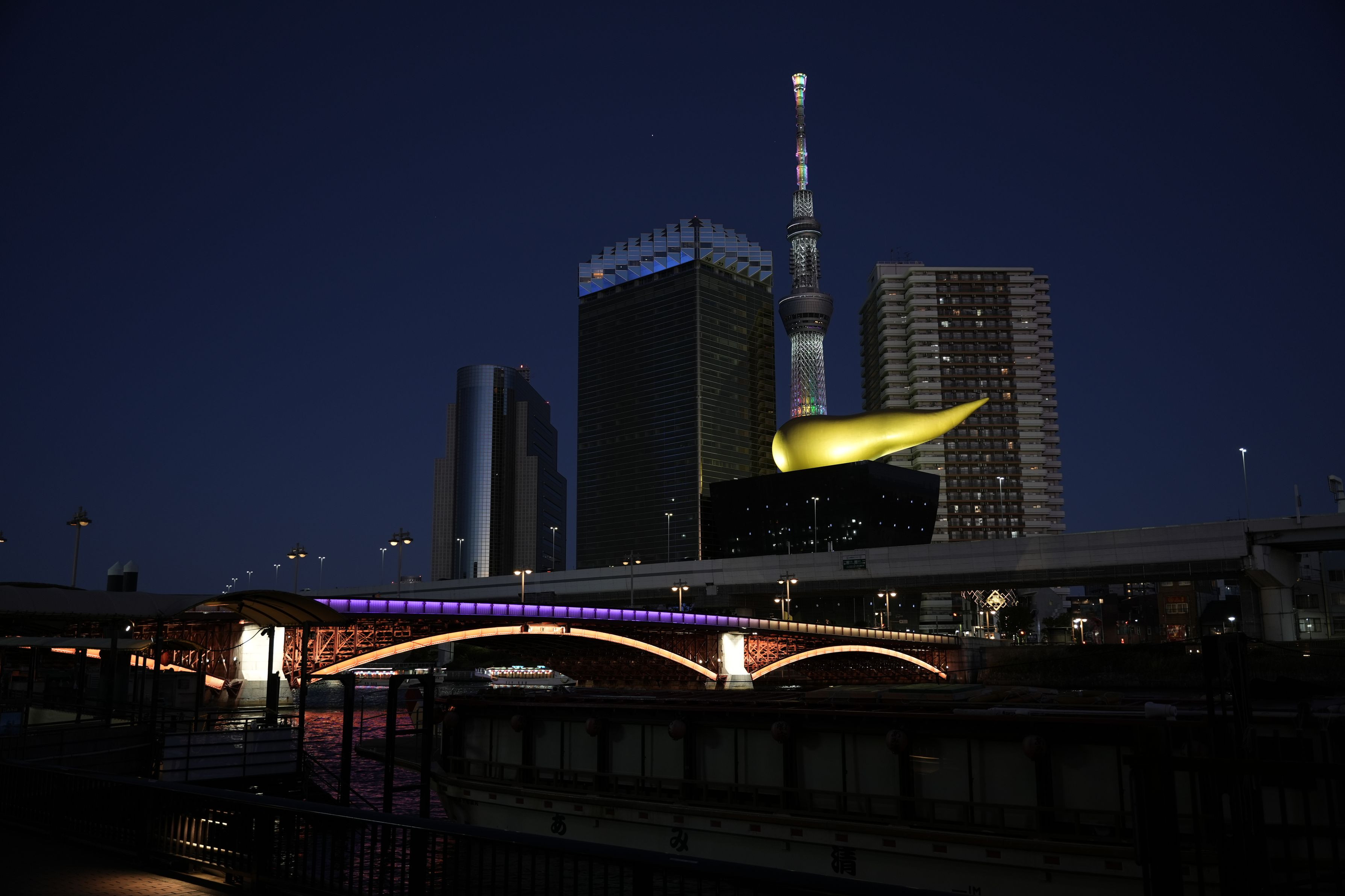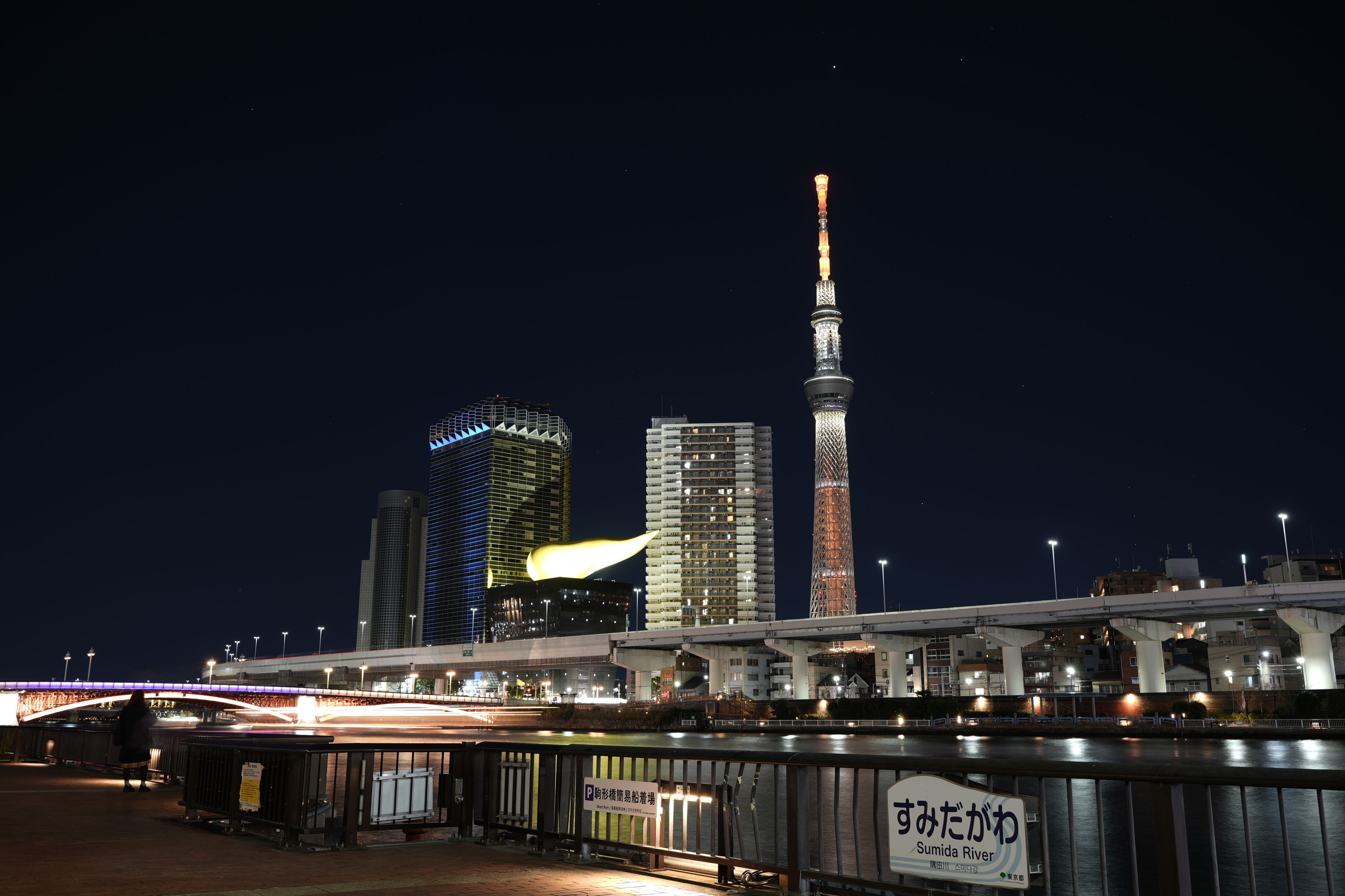 12月29日 泊りがけの東京散策もこれにて終わりとなります。 長らくお付き合いいただき有難う御座いました。 隅田川沿いから金の炎、我妻橋、スカイツリーでございます。