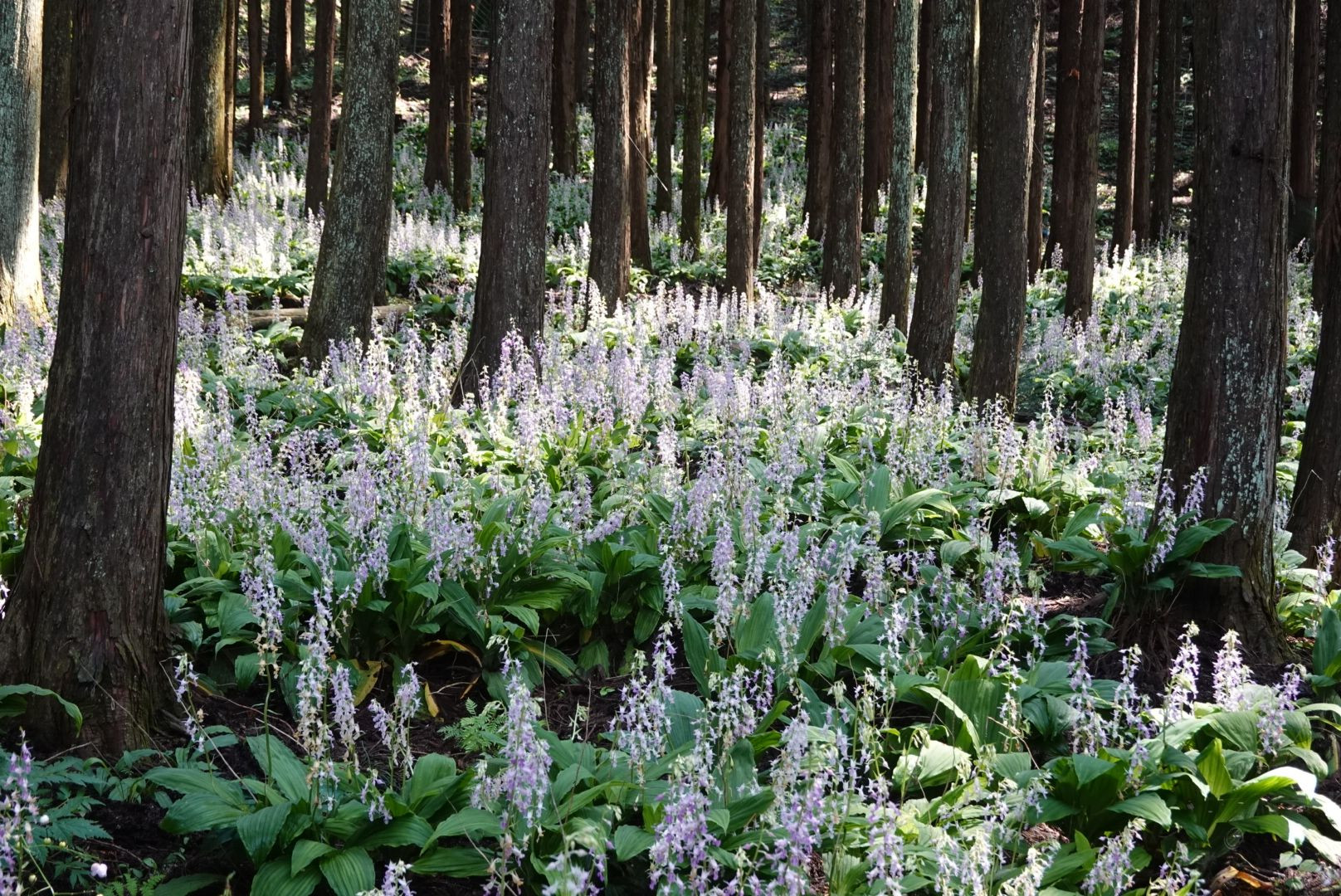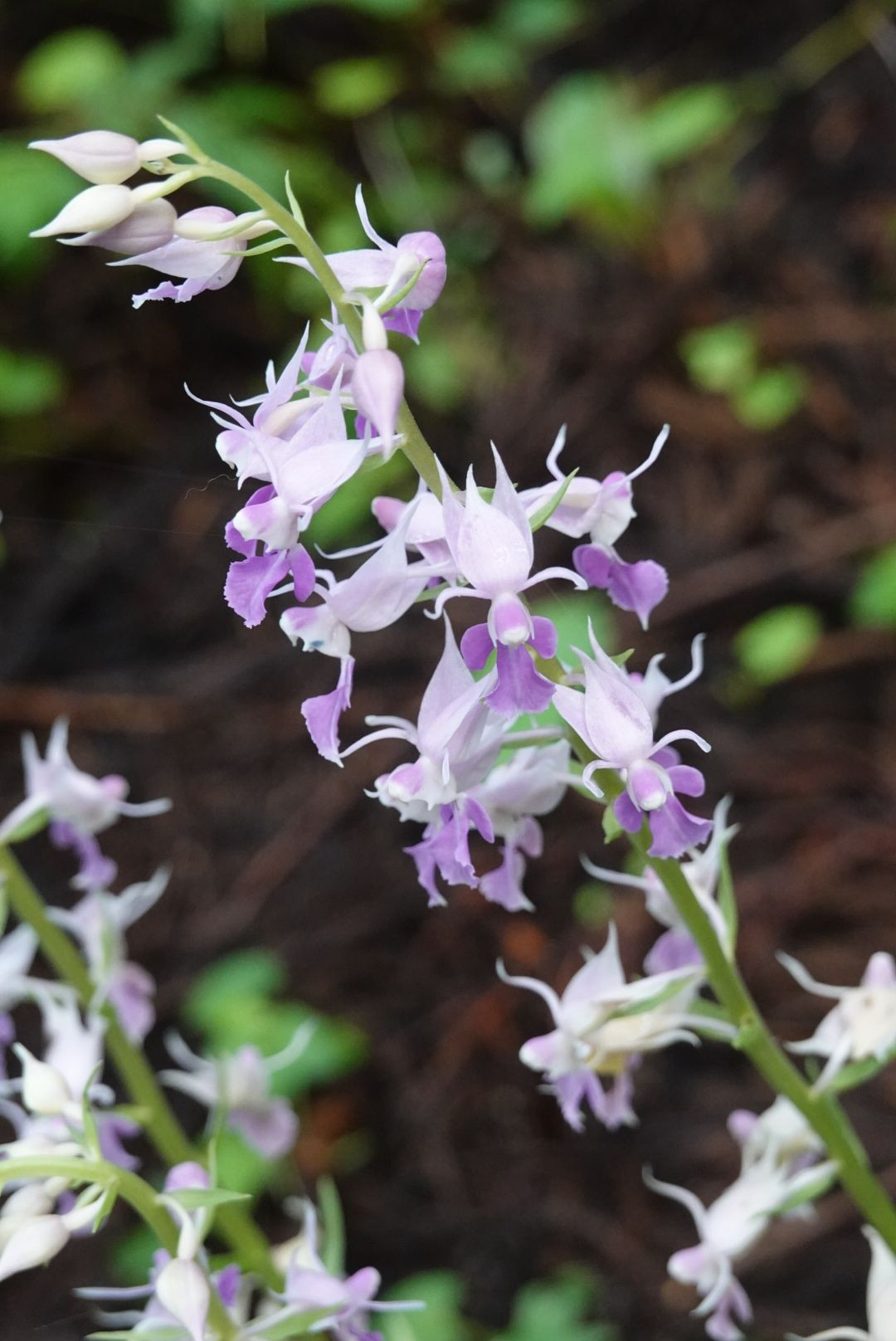 山林に咲く希少な山野草ナツエビネの群生です