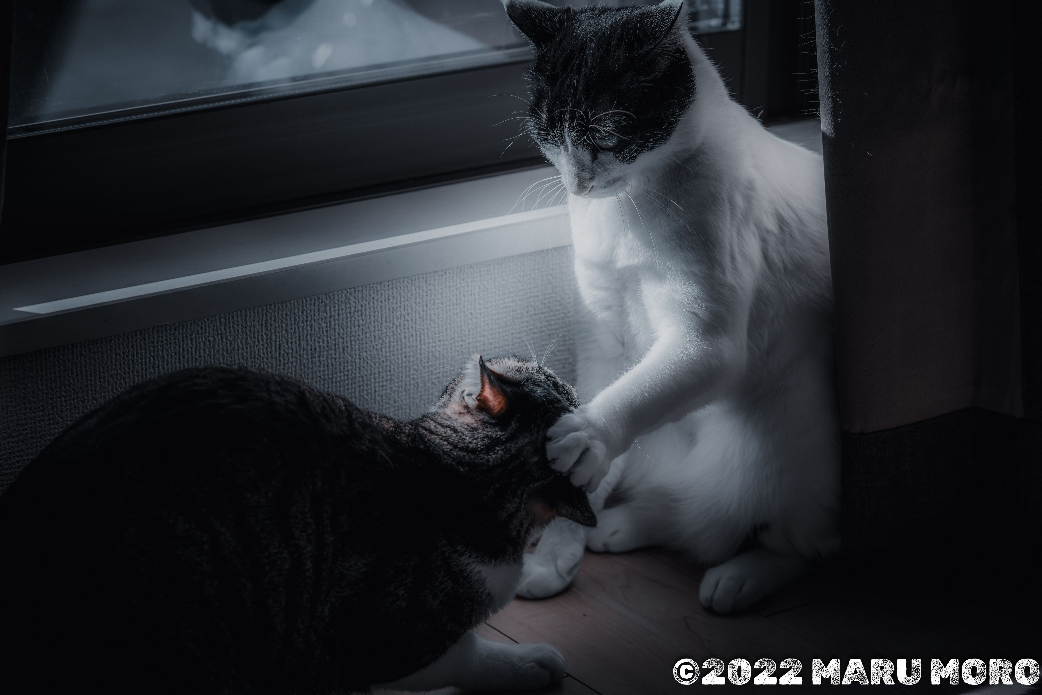 片手で優しくなだめるように態度を改めさせる猫
