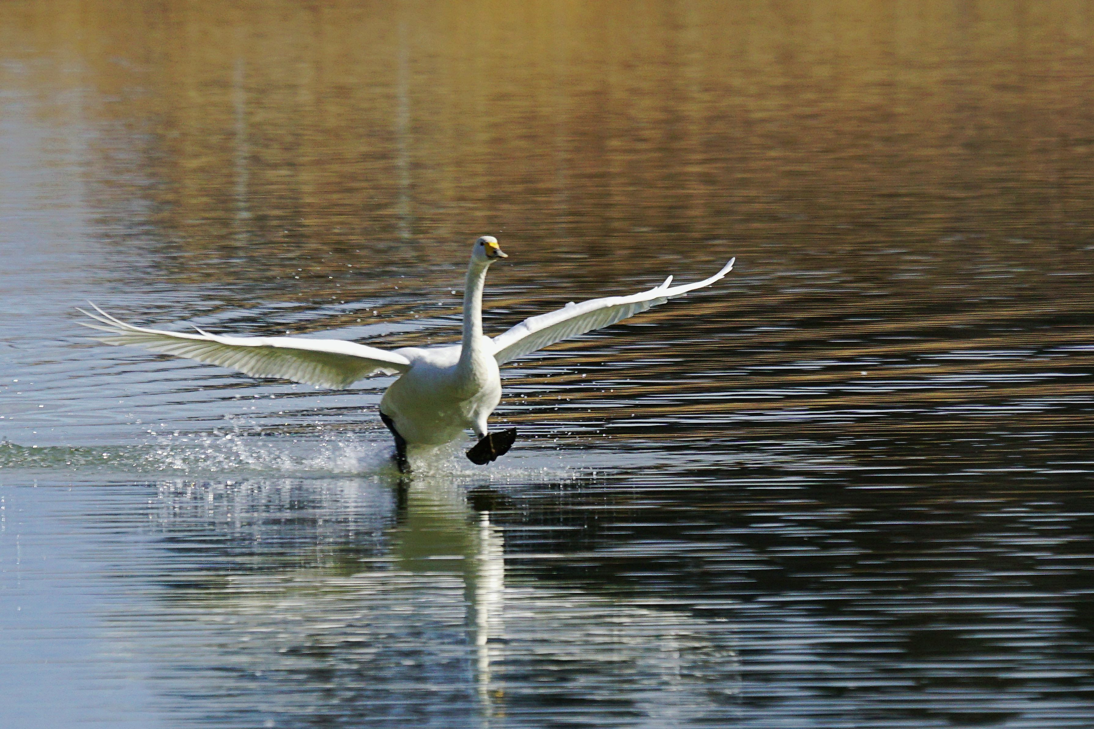 製品情報>My Sony>αcafe>『タラタッタッター』水上でスキップするオオハクチョウ(コーちゃんさん)